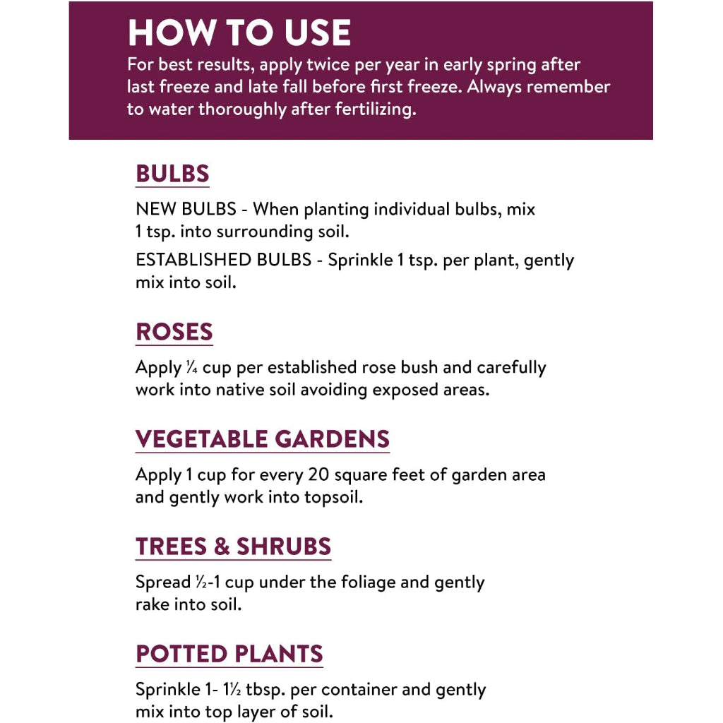 ● IDEAL FOR FALL BULB PLANTING: Bone meal naturally promotes healthy growth of root and bulb crops and has a fine granular consistency for easy spreading. You can also use when planting flowering bulbs in the fall, such as tulips. Plus, it's Made in the USA!