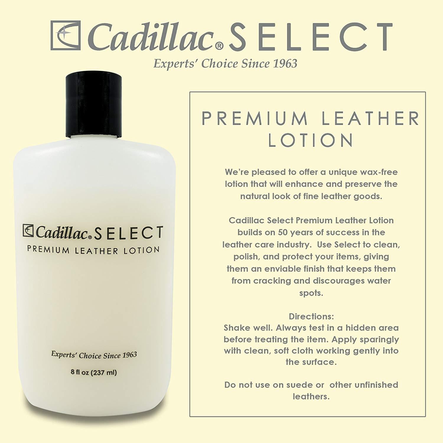 - GREAT FOR USE ON HIGH-END LEATHER FASHION PRODUCTS: Cadillac Select Leather Lotion is the perfect add-on for any leather designer handbag, purse, shoe, boot, jacket, coat, couch, sofa, car upholstery, wallet, belt and much more.