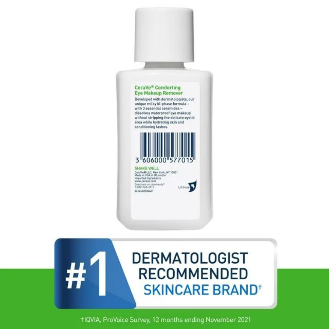 CeraVe’s Comforting Eye Makeup Remover effortlessly removes even the most stubborn eye makeup—including longwear eye makeup and waterproof mascara—without leaving your skin feeling tight or disrupting your protective skin barrier. Eye makeup remover offers a gentle yet effective way to remove makeup around your delicate eye area. Developed with dermatologists, this eye makeup remover has a bi-phase formula with a gentle, milky texture that leaves your eye area feeling soothed and comforted. Skin looks and feels refreshed without any greasy residue left behind.