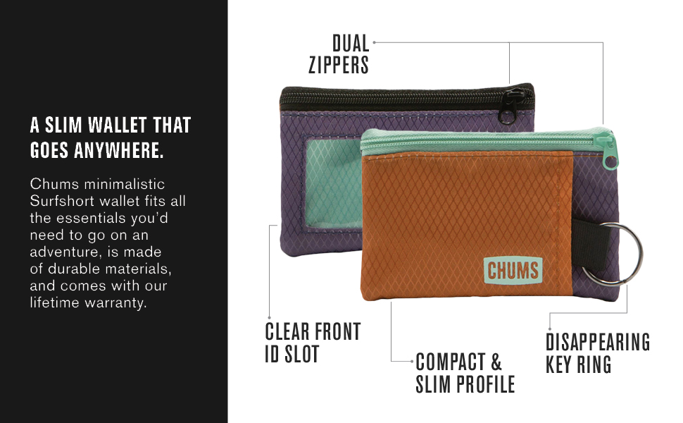 Chums Surfshorts Water Resistant Zippered Minimalist Wallet + Clear ID Window Key Ring Gray & Black