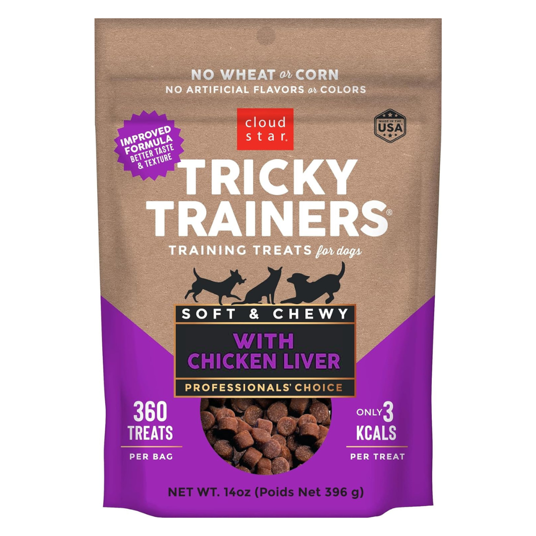 Cloud Star Tricky Trainers has been the choice of professional trainers since 1999, with irresistible flavor to keep dogs’ attention, low calories, and deliciously soft and chewy texture. Each bite-size treat is packed with wholesome ingredients like natural chicken liver, and no corn, wheat, artificial colors or flavors, so you can feel good about rewarding their good behavior - while training or any time!