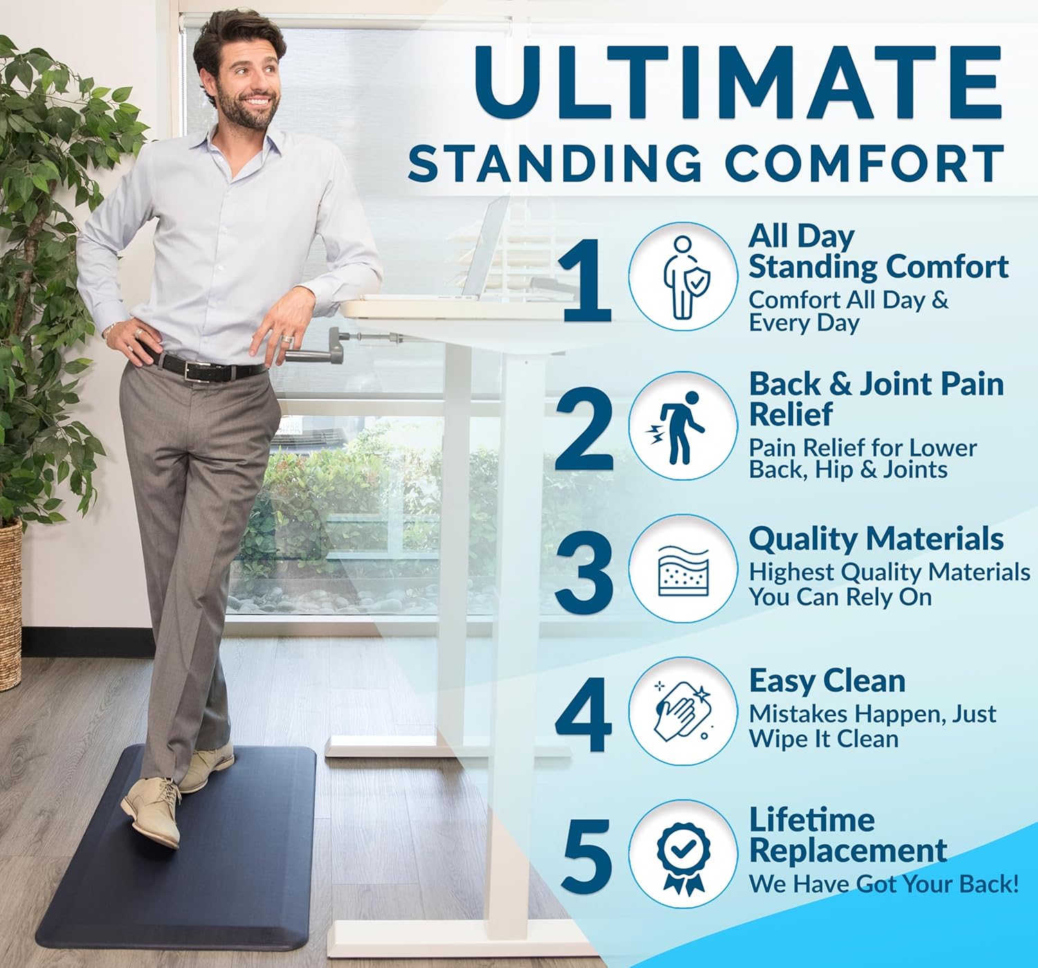 ComfiLife anti-fatigue mat offers 3/4" thick, high-density memory foam for superior comfort and support. Ideal for kitchens, standing desks, laundry rooms, or workbenches, it helps reduce stress on feet, legs, and back. Durable and built for high-traffic areas, it features a non-slip, stain-resistant surface that stays in place and is easy to clean. Just wipe with a damp cloth to maintain a fresh look and lasting comfort wherever you stand.