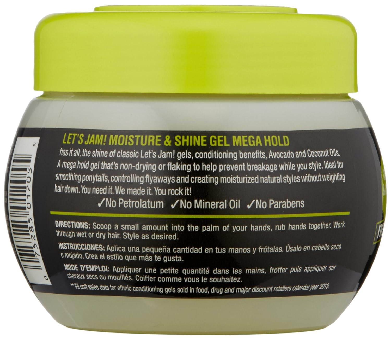 Let's Jam Moisture & Shine Mega Hold Protein Gel's formula combines the shine of classic Let's Jam gels with the conditioning benefits of avocado & coconut oil. A Mega hold that's non-drying or flaking to help prevent breakage while you style. • Ideal for smoothing ponytails, controlling flyaways and creating moisturized natural styles without weighing hair down • Conditions hair as you style • Mega hold • We believe in beauty without compromise Scoop a small amount into the palm of your hands, rub hand together. Work through wet or dry hair. Style as desired. HAIR IS FLAMMABLE. FLAMMABILITY IS INCREASED WHEN TREATED WITH PRODUCTS OF THIS TYPE. KEEP HAIR AWAY FROM OPEN FLAME, LIT TOBACCO PRODUCTS, FIRE OR SPARKS. KEEP OUT OF REACH OF CHILDREN.