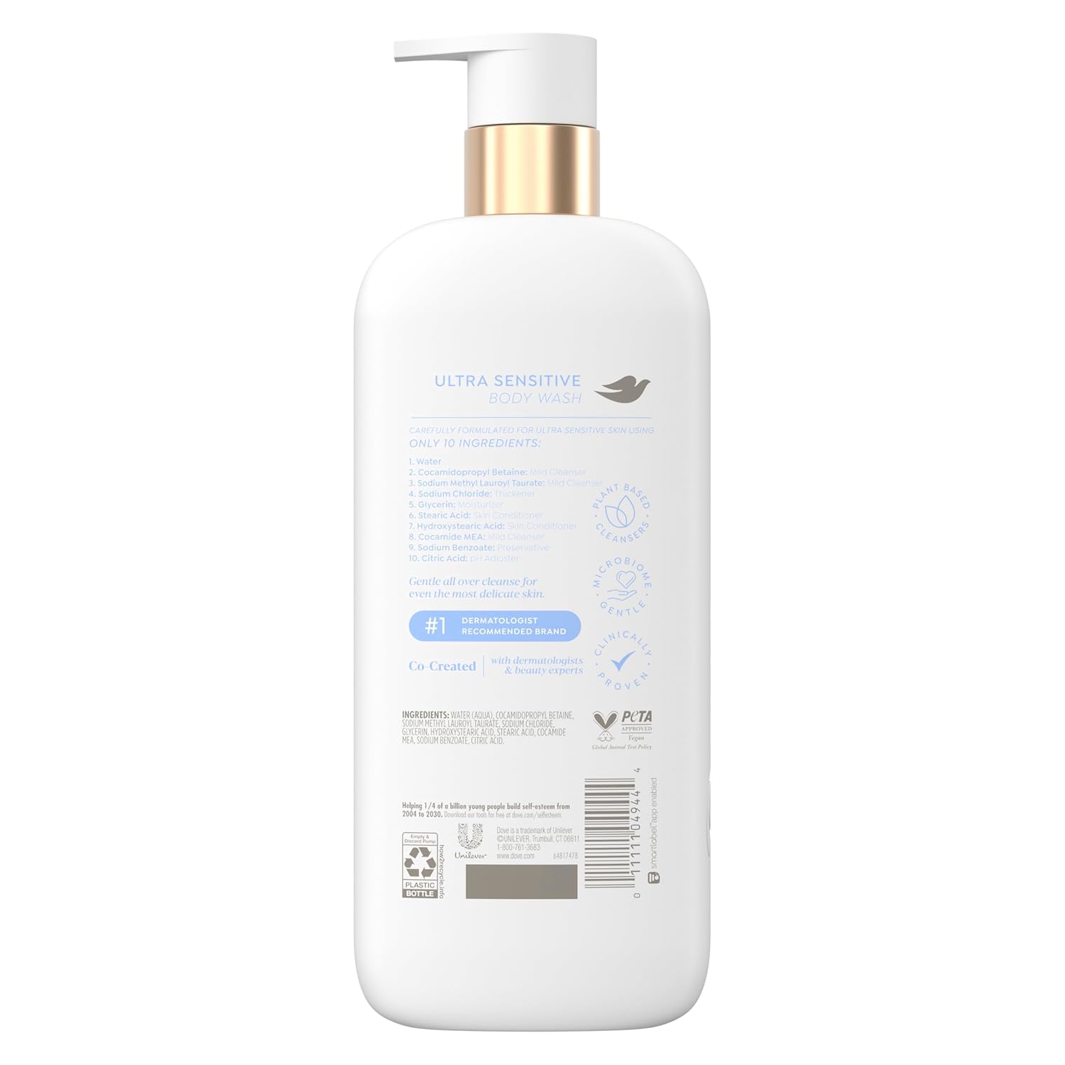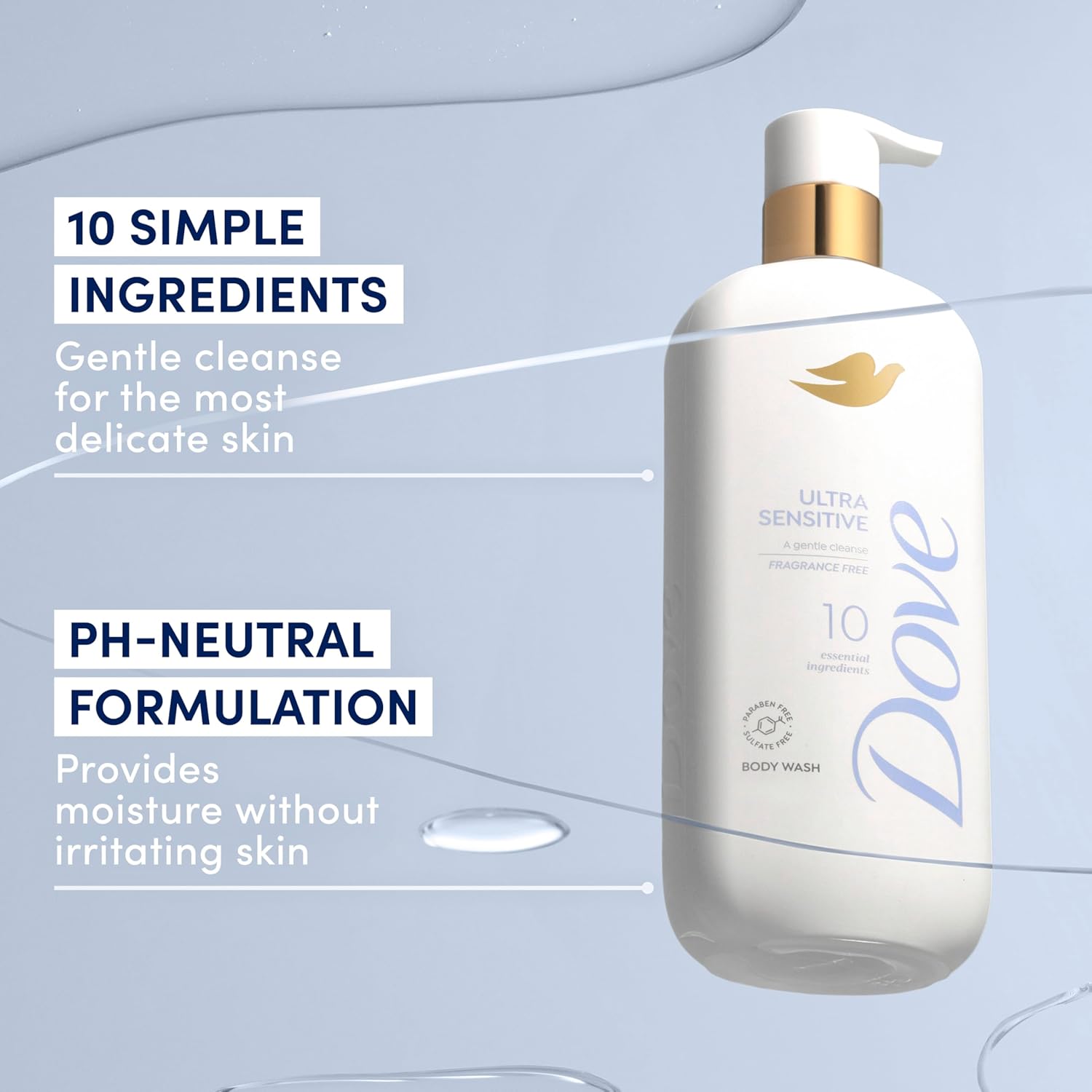 Dove Ultra Sensitive Body Wash is thoughtfully crafted with just 10 essential ingredients to gently cleanse and care for even the most sensitive skin. Fragrance-free and dermatologist-developed, this lightweight gel formula transforms into a soft, bubbly lather that refreshes without irritation. As part of Dove’s Serum Shower Collection, it reflects a commitment to expert care using skin-loving ingredients found in facial skincare—like hyaluronic acid and salicylic acid. Free from sulfates and parabens, and certified vegan by PETA, it delivers a soothing, effective cleanse for skin that needs a little extra care.