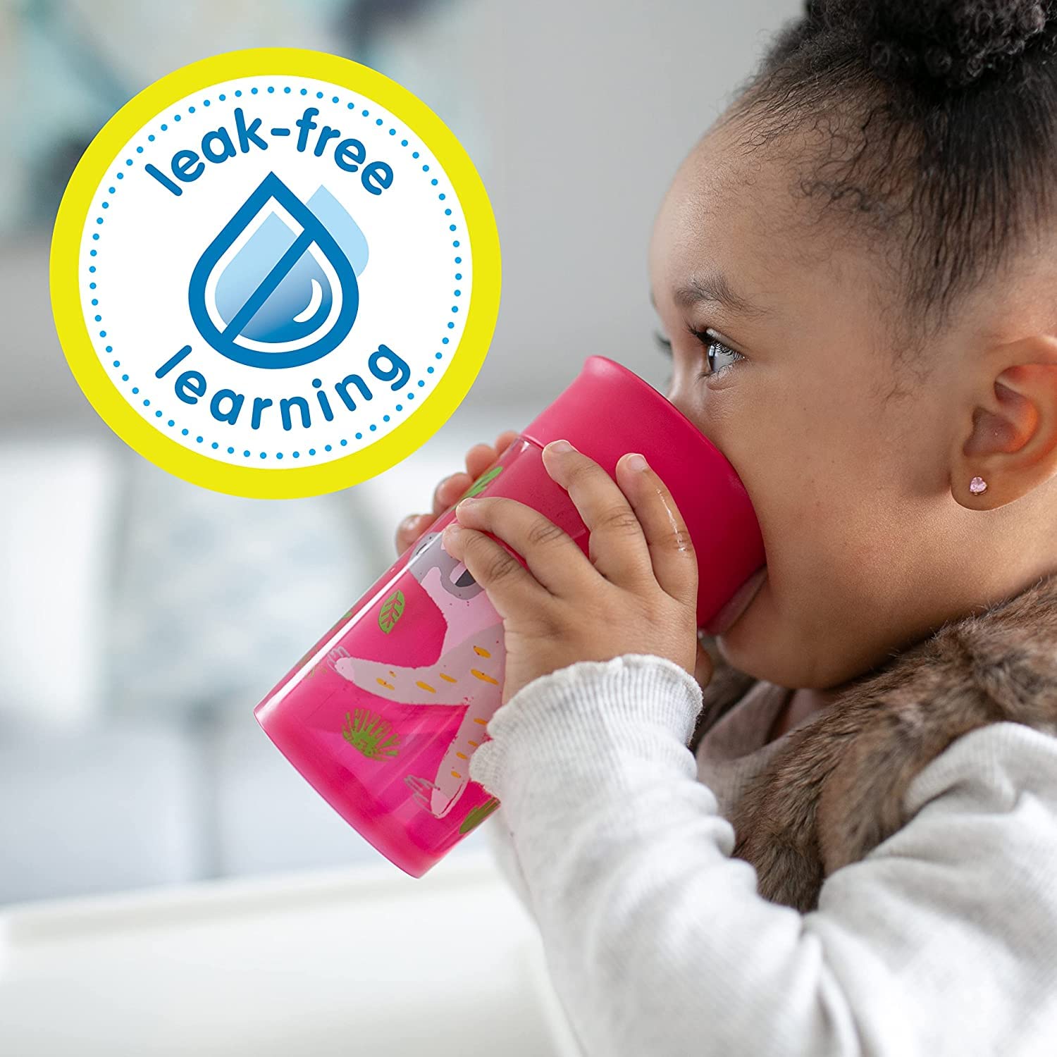 Make their transition to a big kid cup a success with Dr. Brown’s Milestones Cheers 360 Spoutless Cup with Handles. This 360-degree sippy cup lets baby drink from any edge, and the Sip and See clear silicone valve lets baby see inside without spilling for true leak-free learning. Handles designed with your little one in mind are easy to grasp and tilt while developing independent drinking skills. The three-piece design makes assembly and cleaning a cinch! As baby’s drinking skills improve, just remove the valve to use as a true big kid cup. The translucent sides make it easy to tell when it’s time for a refill. Baby will go wild for cute animal prints! This sippy cup for babies and toddlers comes with a travel-friendly lid. Dishwasher safe (top rack) and BPA-free.