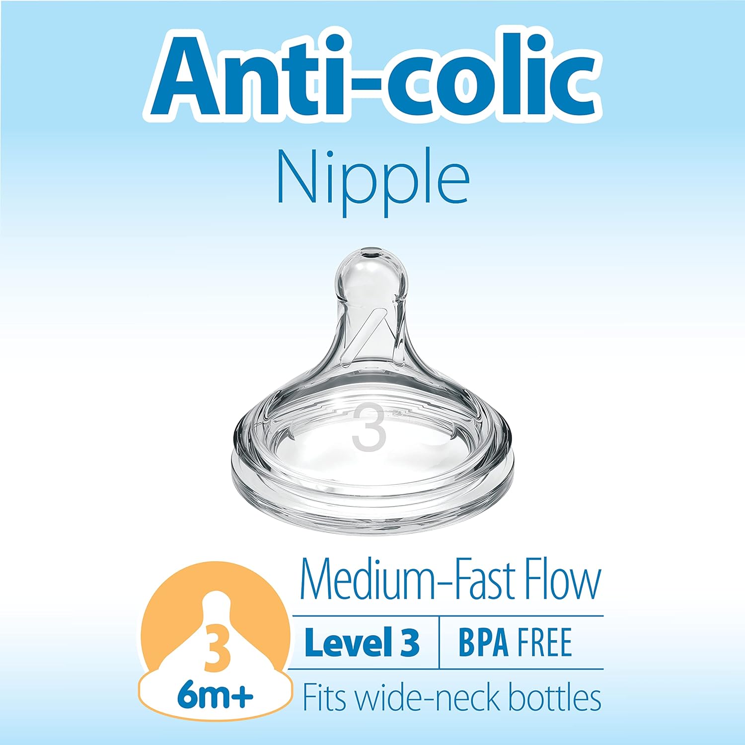 Dr. Brown’s Natural Flow® Level 3 Nipple is the next step for babies 6 months+. Dr. Brown’s® Level 3 Nipple, together with the Anti-Colic internal vent system, is clinically proven to reduce colic. Dr. Brown’s® bottle and nipple provide a more comfortable feeding experience for baby by decreasing spit-up, burping and gas. This vacuum-free feeding is closest to breastfeeding and Dr. Brown’s® Medium-Fast Flow Nipples provide a consistent flow so baby can feed at their own pace. The breast-like nipple shape encourages a proper latch for a more natural bottle feeding experience and eases the transition from breast to bottle and back again. The Level 3 Nipple and Anti-Colic vent system is proven to help preserve bottle milk nutrients and aid in digestion for a better night’s sleep. Made of super-soft, 100% silicone, the Level 3 Nipple fits all Dr. Brown’s® Options+™ wide-neck bottles. The suggested age range for the Level 3 Nipple is 6 months+, but baby’s preferred flow rate may vary. Safe for use in dishwasher (top rack only), electric and microwave sterilizers or boiling water. BPA free.