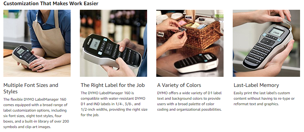 The DYMO LabelManager 160 prints durable, water-resistant labels that make it easy to access files, charts, tools, and more. A familiar QWERTY-style keyboard lets users quickly enter text, then edit and customize with one-touch fast-formatting keys for a perfect, professional label every time.