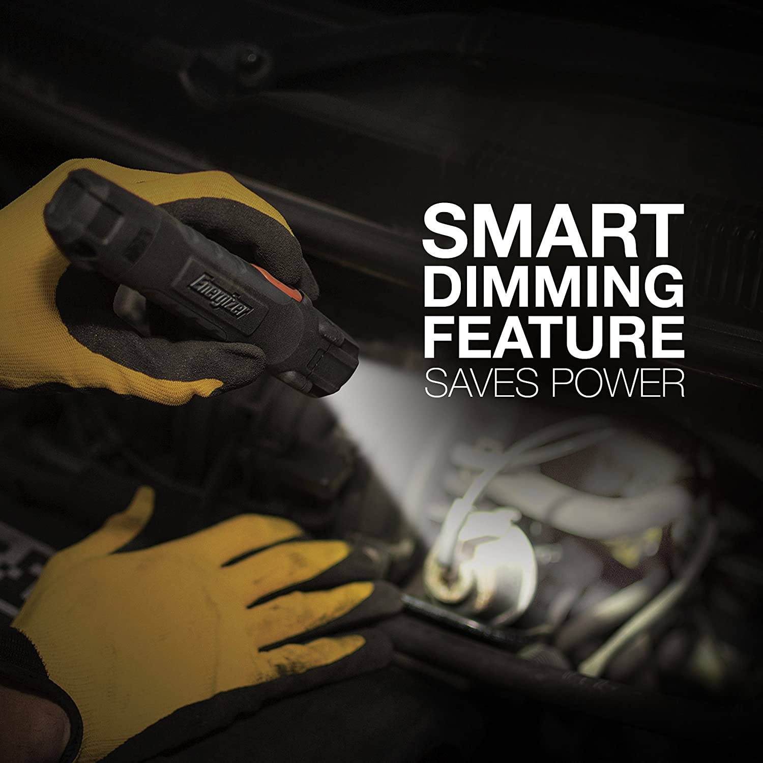 On-site or on the field, Energizer Hard Case Professional Task Light LED Flashlight has the rugged dependability your job demands combined with innovative LED light technology you need to get the job done. Kick it, drop it, knock it: This task flashlight’s rugged ABS, steel, and rubber construction and weather-resistant design help it withstand drops from up to 7 meters and work in even the most challenging conditions. Easy to use, even if you’re wearing utility gloves… the extra-large button on this utility work light makes sure you always find the switch. Alternate between high and low modes for customized brightness and runtime: Get up to 300 lumens of clear, bright, powerful light and a runtime of up to 6.5 hours on high, or use the Energizer Smart Dimming feature to save power with a runtime of up to 65 hours on low.