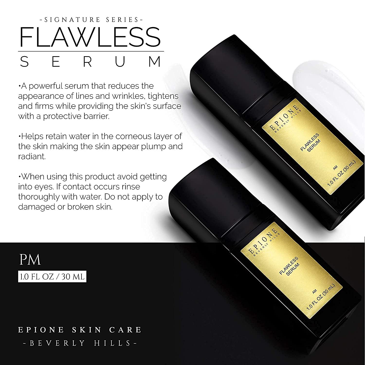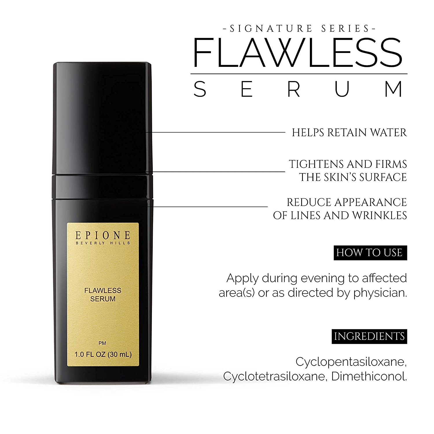 Flawless serum retains water in the corneous layer of the skin making skin appear radiant. Epione products were developed by Dr. Simon Ourian to offer real solutions to his Beverly Hills celebrity cosmetic dermatology clients. Apply during evening to affected area(s) or as directed by physician.