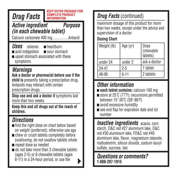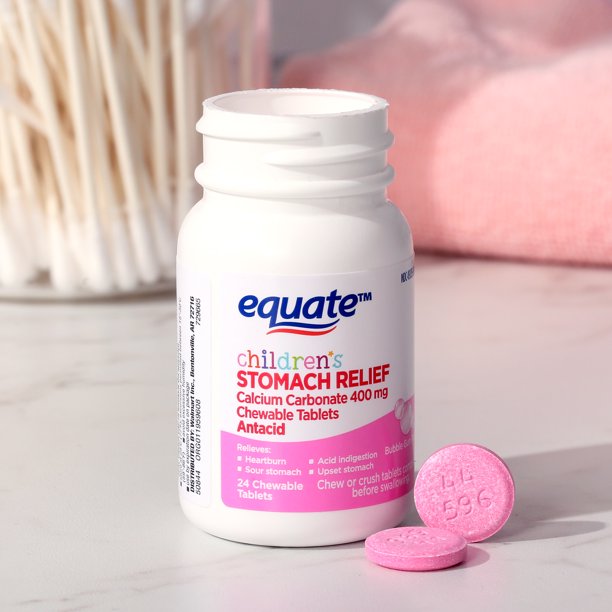 Treat your child's upset tummy with Equate Children's Stomach Relief Antac id. These chewable tablets help relieve heartburn, acid indigestion, sour stomach and upset stomach. With a yummy bubble gum flavor, these children's antac id tablets have 400mg of calcium carbonate per tablet. Chew or crush tablets completely before swallowing. These tablets are good for children ages two and older. Please refer to the dosage chart on the package for the correct amount to give your child. Give your child the help they need with Equate Children's Stomach Relief Antaci d.
