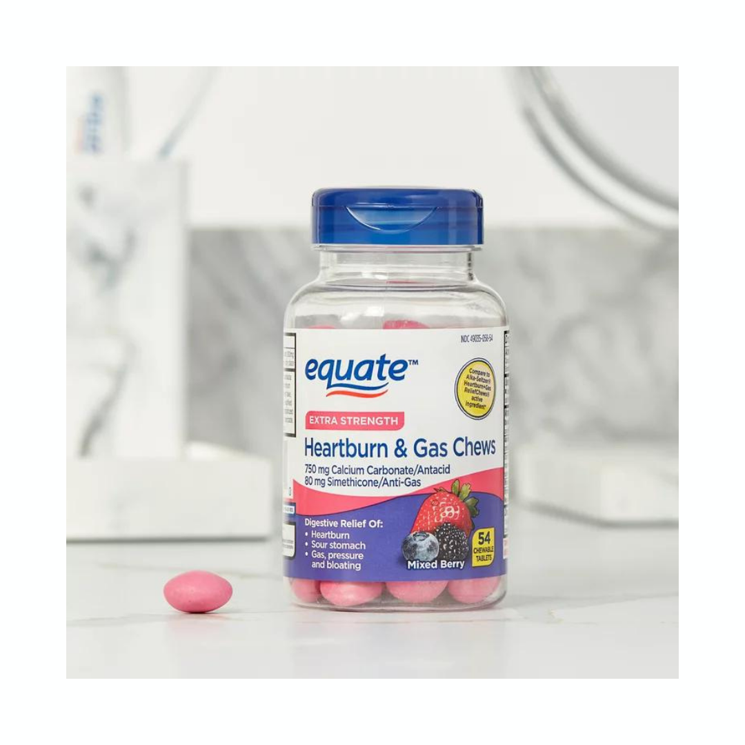 Equate Extra Strength Antacid and Ani-Gas Chews are specially formulated to address several types of stomach discomfort to provide you with the relief you need. Each of the 54 soft tablets is chewable and delivers a tasty mixed berry flavor for you to enjoy as you chew. These antacid tablets offer quick relief of indigestion, heartburn, and sour stomach to ease symptoms such as: bloating, pressure and gas. Their extra-strength formula ensures that you can enjoy a night out to dinner with friends and family and eat the foods you love without receiving any discomfort. Calm your digestive tract with Equate Extra Strength Antacid and Ani-Gas Chews.