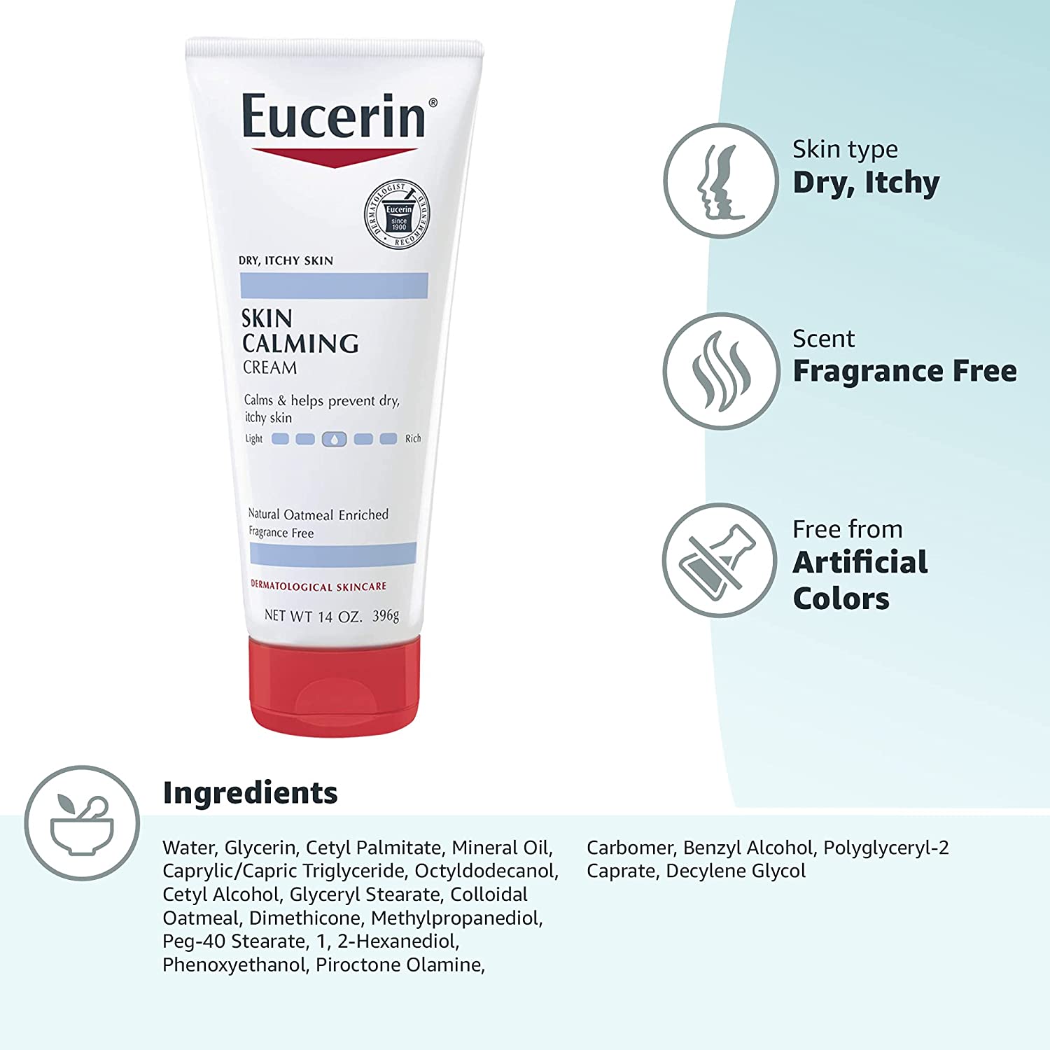 Eucerin’s Skin Calming Cream provides 24 hour moisture and long term control of dry, itchy skin. Delivers 24 hour hydration and soothes dry, itchy skin. Enriched with soothing oatmeal. Fragrance and dye free. The gentle formula contains soothing oatmeal that provides relief from itch and contains rich emollients that help moisturize and protect skin. The cream is easy to apply, non-greasy and is easily absorbed. Skin Calming Cream is safe for sensitive skin, fragrance and dye free, and is non-comedogenic.