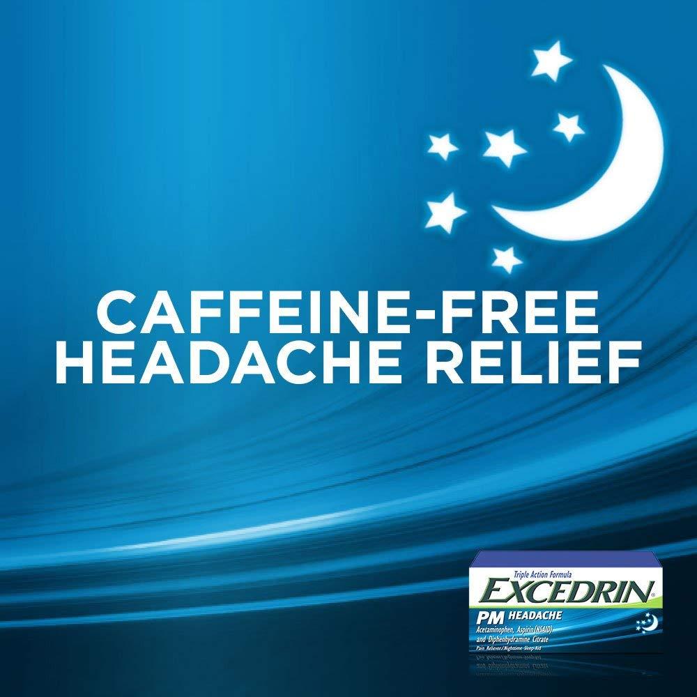 Fast Headache Relief -Excedrin PM Headache gives temporary relief of occasional headaches at night, and minor aches & pains with accompanying sleeplessness. The caffeine-free, triple action formula is a non-habit forming nighttime solution.