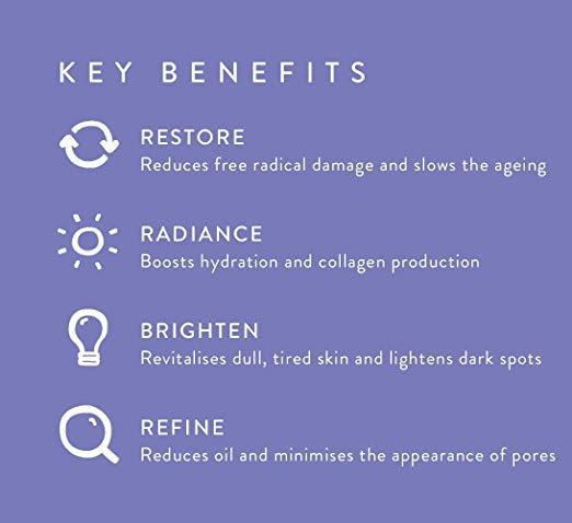 - Benefits: RESTORE: Reduces free radical damage and slows the aging process. RADIANCE: Boosts hydration and collagen production. BRIGHTEN: Revitalises dull, tired skin and lightens dark spots. REFINE: Reduces oil and minimizes the appearance of pores. DESERT LIME: Hydrates and stimulates collagen. DAVIDSON PLUM: Brightens and rejuvenates dull, tired skin. BENTONITE CLAY: Deep cleans and purges skin of impurities. ALOE VERA: Soothes and reduces redness.