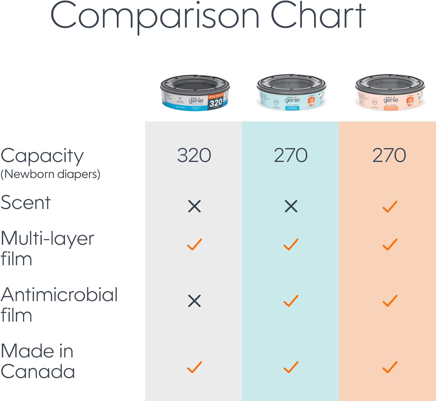 The Diaper Genie Essentials Round Refill 4-pk can hold up to 1280 newborn-sized diapers and is made from durable multi-layer film that features odor-locking barrier technology preventing odors from escaping and keeping your nursery fresh. Compatible with Diaper Genie Complete Pail and Expressions Pail.