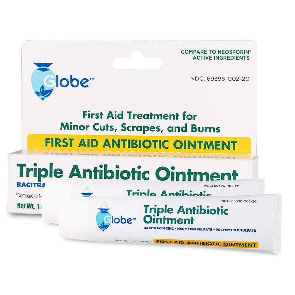Globe triple antibiotic ointment can be used at home to prevent and treat minor skin injuries and infections caused by cuts, scrapes or burns. This convenient and effective formula contains three active antibiotic ingredients to stop the growth of bacteria and reduce pain and inflammation. Triple antibiotic ointment is available without a prescription. Compare to Neosporin.