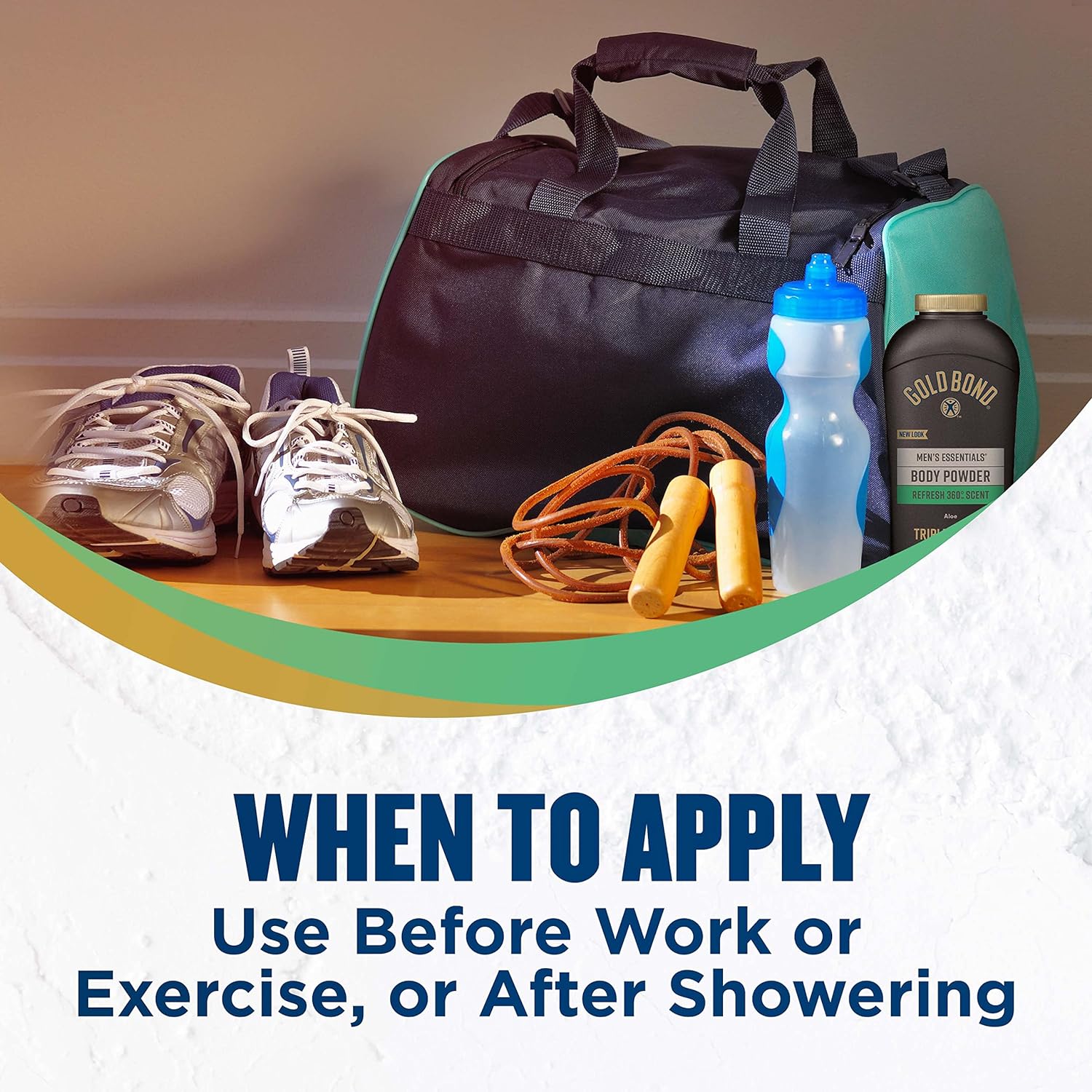 Take control of wetness and odor caused by everyday activities. Try Gold Bond Men's Essentials Talc-Free Body Powder in Refresh 360 Scent. This body powder for men has a unique triple action formula that absorbs moisture, cools skin, and refreshes. Best of all, Gold Bond Men's Essentials Body Powder provides all over odor* and wetness control. You won't be the only one who likes the crisp, irresistible scent. Feel confident using this men's body powder before exercising or heading out for the night. For best results, apply just after showering once skin is dry. Now talc-free and formulated without parabens and preservatives. *Absorbs odor-causing sweat.