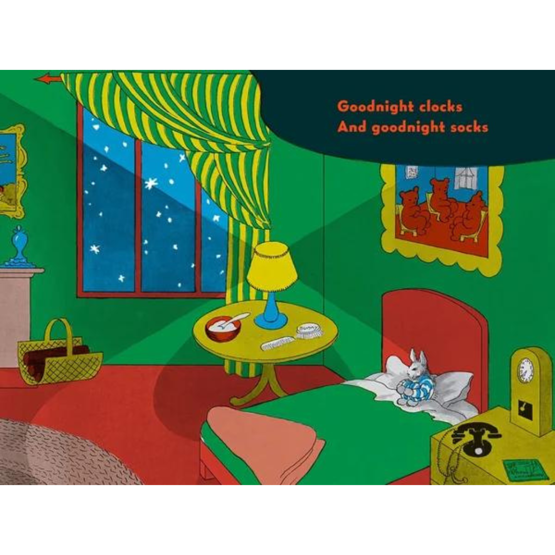 In a great green room, tucked away in bed, is a little bunny. "Goodnight room, goodnight moon." And to all the familiar things in the softly lit room—to the picture of the three little bears sitting on chairs, to the clocks and his socks, to the mittens and the kittens, to everything one by one—the little bunny says goodnight.