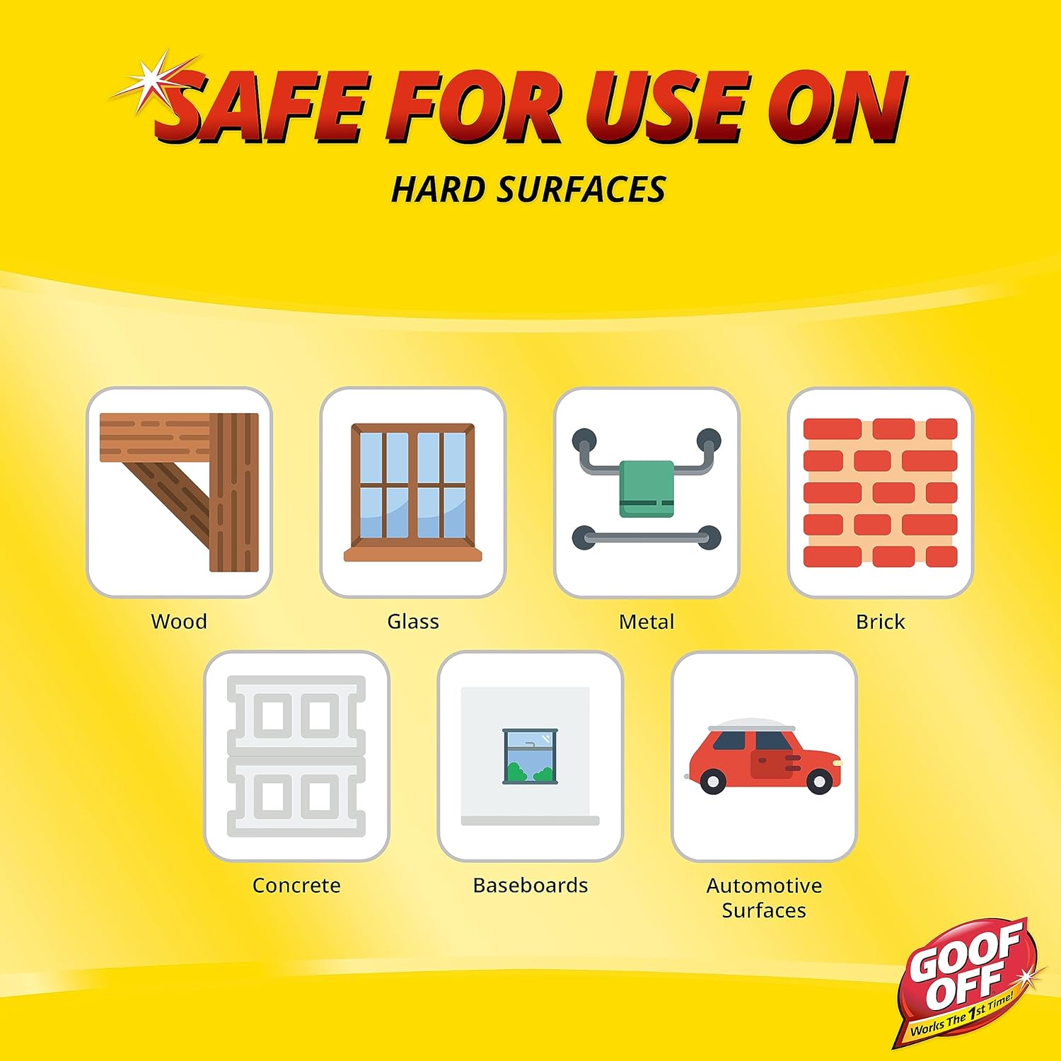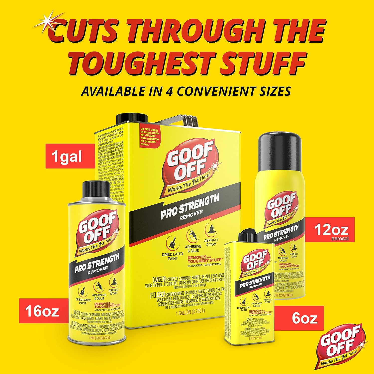 Smells strong because when you work hard, you get smelly. Goof Off Pro Strength Remover works the first time quickly and easily removing tough spots and stains, like chewing gum, that ordinary household cleaners can’t. Removes: adhesives & glue, crayon, pen & marker, gum, scuff marks, stickers & decals, asphalt & tar, dried latex paint, duct tape, caulk, tree sap, candle wax and more. Ideal for all kinds of hard surfaces such as metals, glass, brick, wood, concrete, grout, fiberglass, hand tools and most automotive surfaces. Comes in a wide array of sizes including aerosol. Warning: This product can expose you to chemicals including Ethylbenzene, which is known to the State of California to cause cancer, and Methanol, which is known to the State of California to cause birth defects or other reproductive harm.