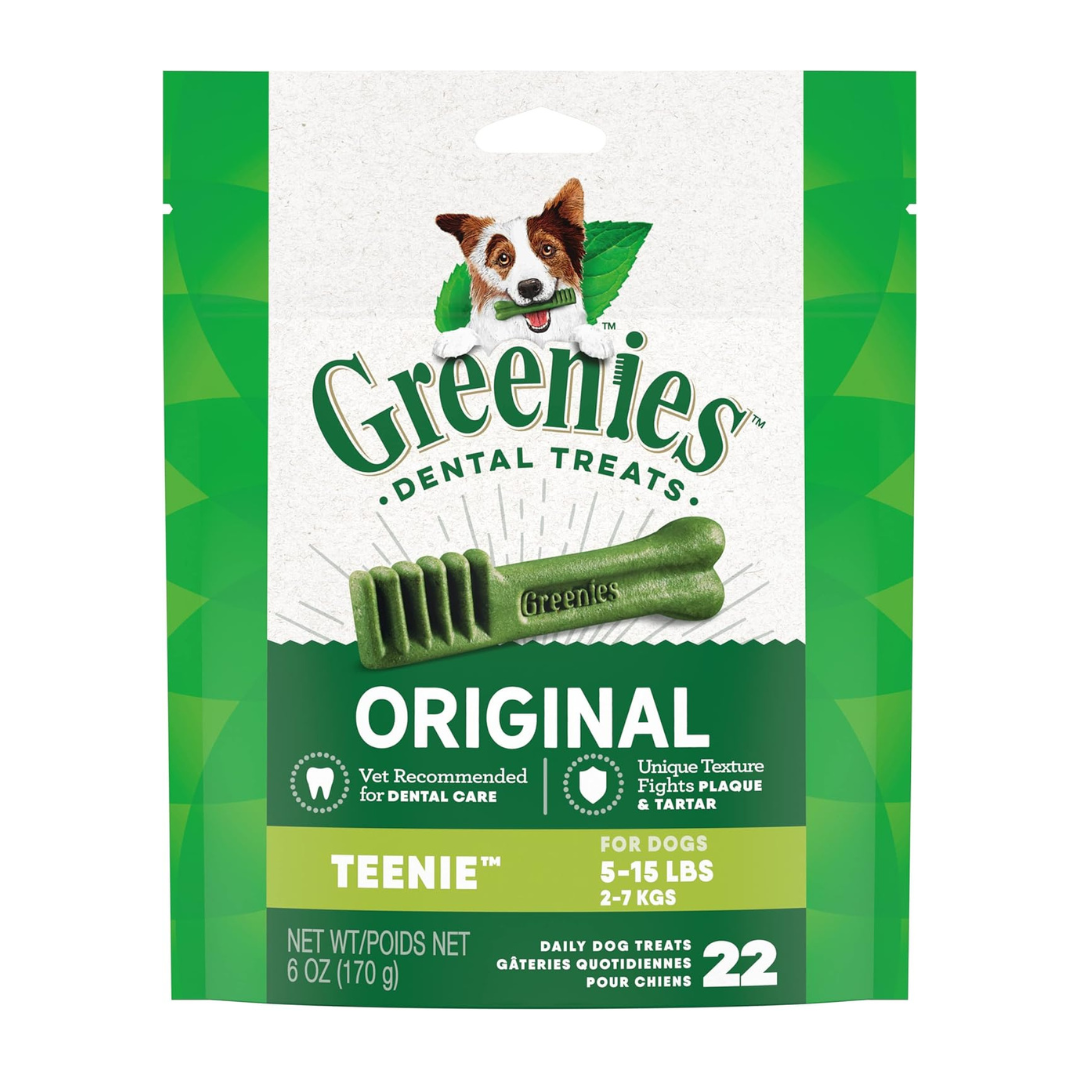 Greenies Original Teenie Dental Dog Treats are vet-recommended dental chews designed for small dogs. These tasty treats clean teeth, control plaque and tartar buildup, and freshen breath. Made with natural ingredients and easy to digest, each 6 oz. pack includes 22 treats perfectly sized for dogs under 15 lbs.