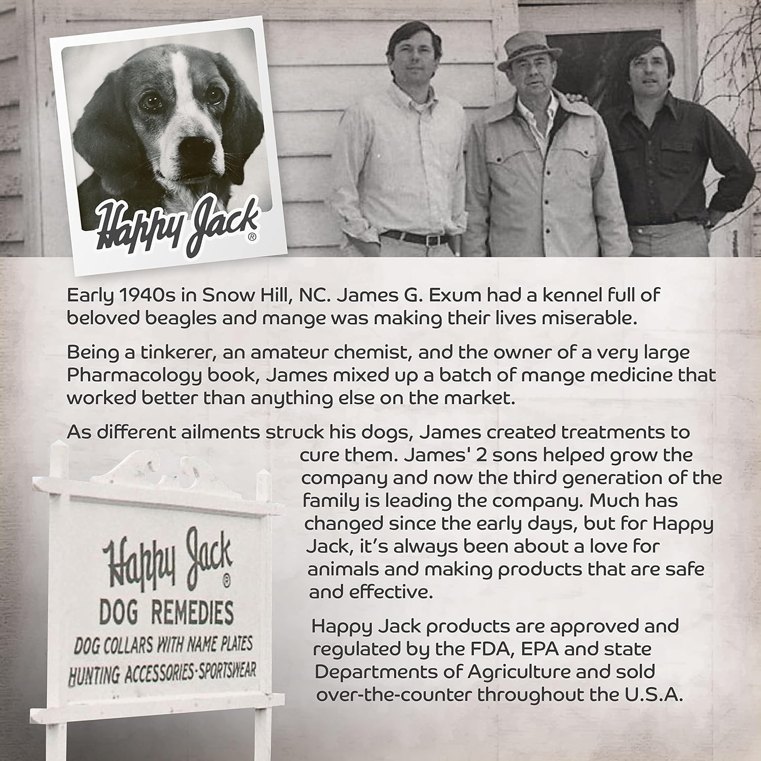 Like a lot of great American success stories, Happy Jack is a company born of necessity. It was the early 1940s in Snow Hill, NC. James G Exum had a kennel full of beloved beagles with mange. Being a tinkerer, amateur chemist, and the owner of a very large Pharmacology book, James mixed up a batch of mange medicine that worked better than anything else on the market. As different ailments struck his dogs, James created treatments to cure them.