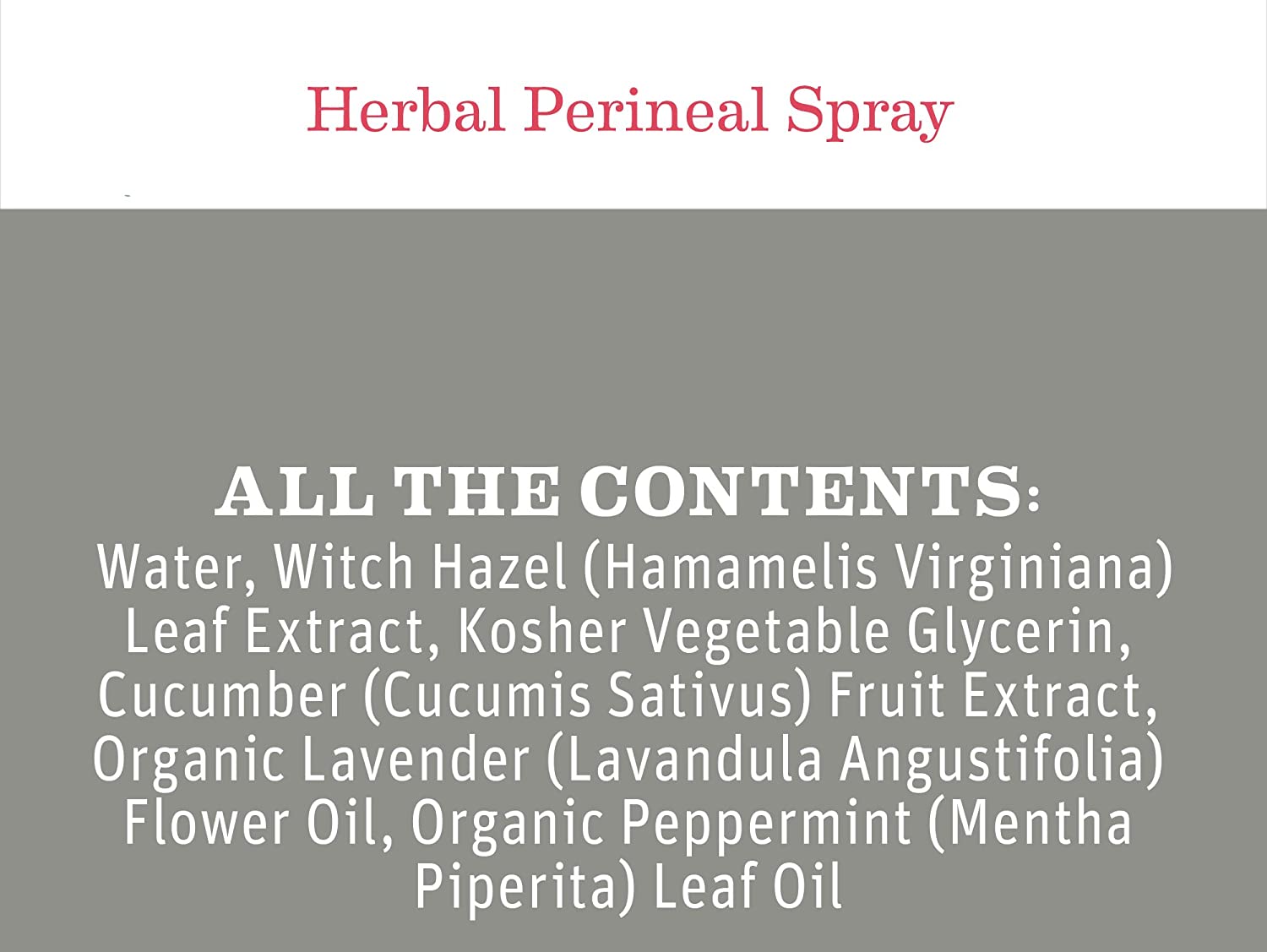 Herbal Perineal Spray by Earth Mama | Safe for Pregnancy and Postpartum, 4-Fluid OunceEarth Mama Herbal Perineal Spray for Pregnancy and Postpartum, 4-Fluid Ounce With organic herbs traditionally used for postpartum relief and to help soothe perineal discomfort before and after childbirth No parabens, butane, propellants, or artificial fragrance Pack it in your birth bag and take it with your peri bottle for those first post childbirth bathroom trips Mist as often as needed, especially after bath or toilet use Herbal Perineal Spray For cooling comfort 'Down There' Cooling perineal mist with herbs traditionally used to helps ease prenatal and postpartum discomfort during pregnancy and after childbirth. Formulated with natural herbal ingredients, including astringent witch hazel, antibacterial lavender, and cooling peppermint pure essential oil.