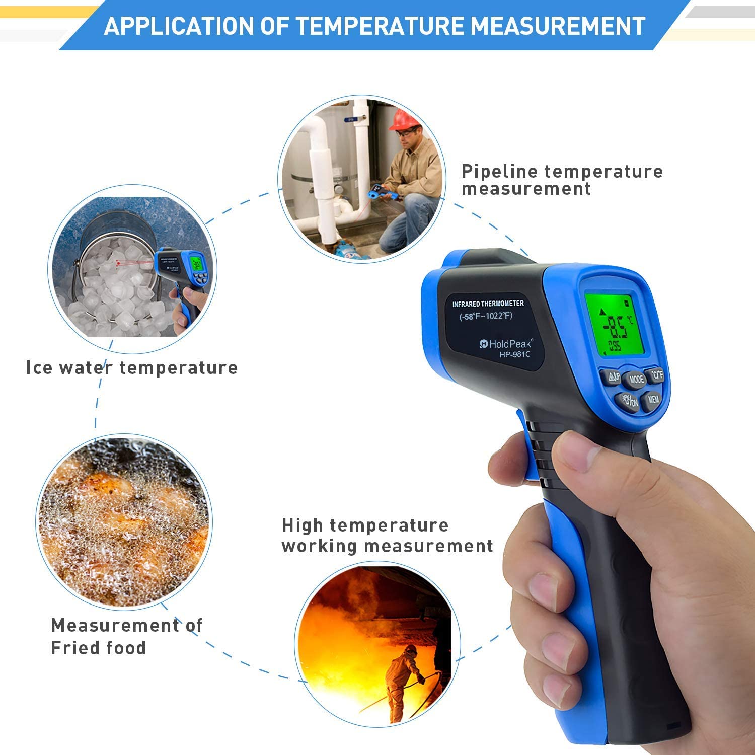 HOLDPEAK 981C Infrared Thermometer Non-Contact Digital Laser Temperature Gun with LCD Display --58 to 1022℉ (-50 to 550℃) Adjustable Emissivity (NOT for Humans)