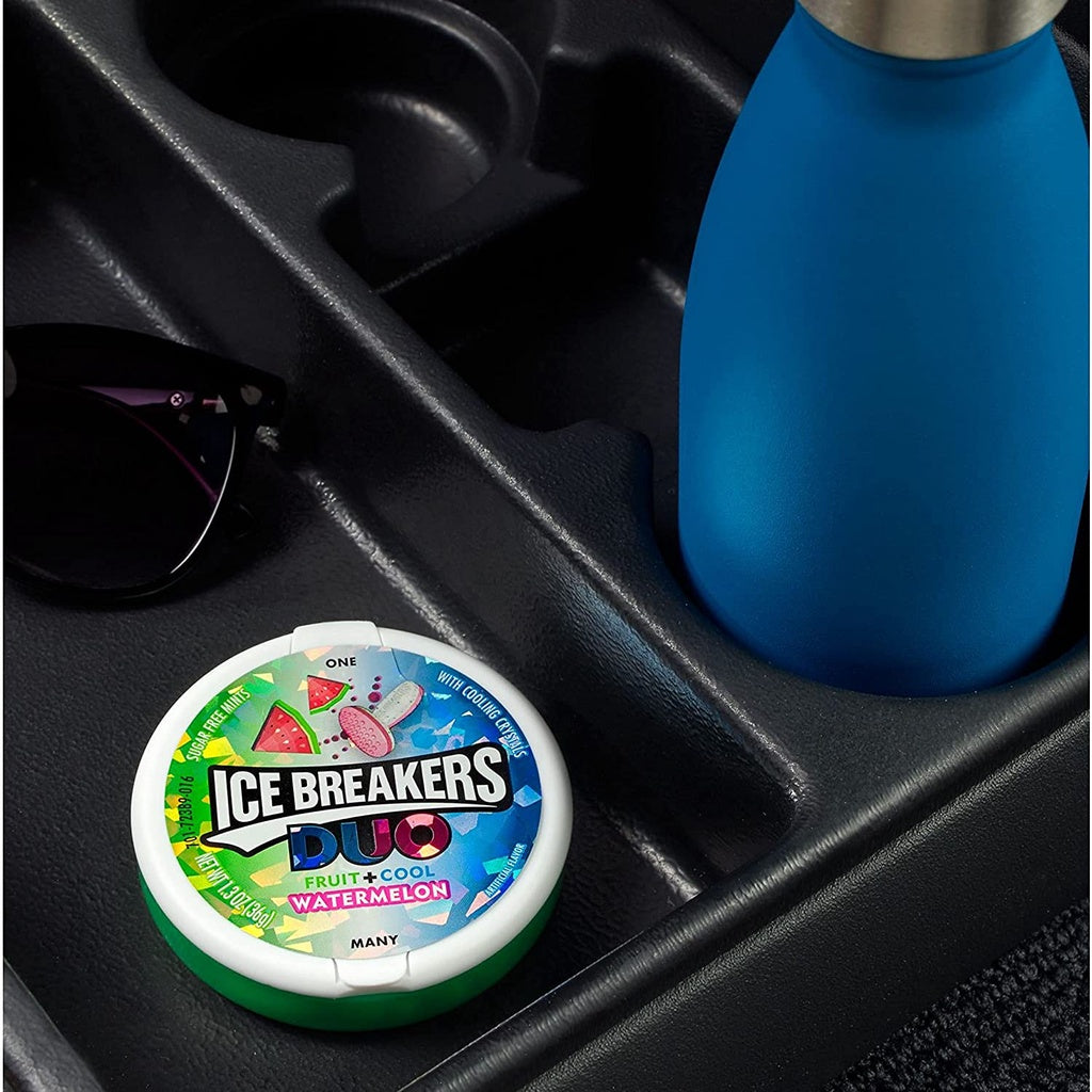 ● Cool, watermelon-flavored ICE BREAKERS DUO mints are packaged in a mint tin you can take with you anywhere for all-day access