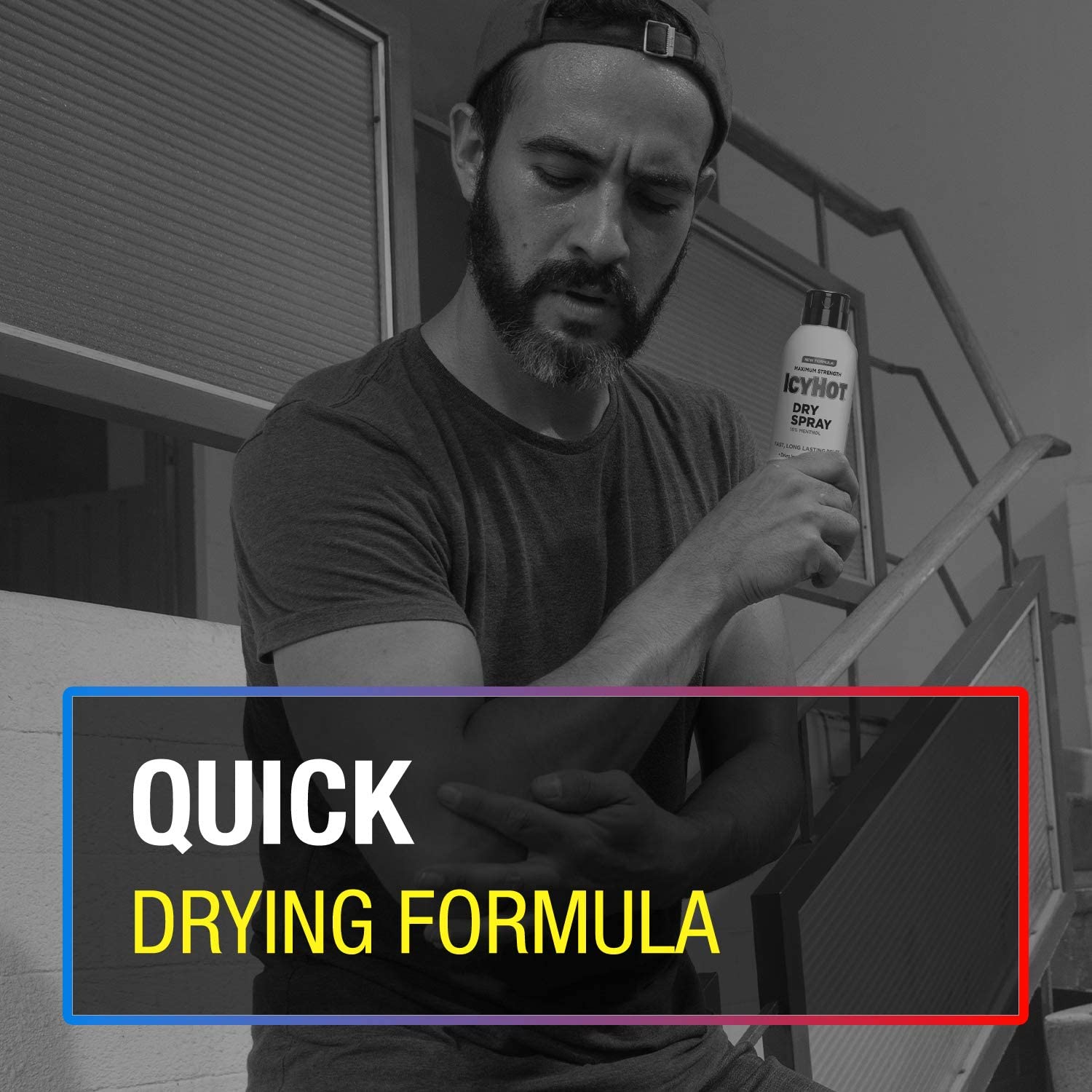 Experience powerful pain relief at the push of a button. Icy Hot Maximum Strength Dry Spray provides fast-acting pain relief for minor aches and pains associated with arthritis, back pain, sore muscles, sprains, bruises and muscle cramps. It's icy to dull the pain, then hot to relax it away. Just point, spray and start feeling pain relief fast. This no-mess pain reliever spray is formulated to dry instantly and sprays from any angle for quick pain relief when and where you need it most. At the gym, at home or on the job, rely on Icy Hot Dry Spray for lasting pain relief. Icy Hot is the No. 1 topical pain relief brand.* *Among OTC topical analgesics. HOW TO USE: Spray affected area with desired amount of product. Allow the product to dry; it does not need to be rubbed in. Reapply as necessary, but no more than 3 to 4 times daily.