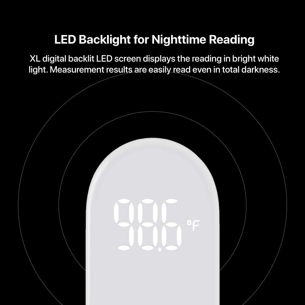 The intuitive single-button control design thermometer reads the temperature in just 1 second from a clear bright large LED screen, even in total darkness. The quiet vibrating alert eliminates buzzing noise or disturbance.