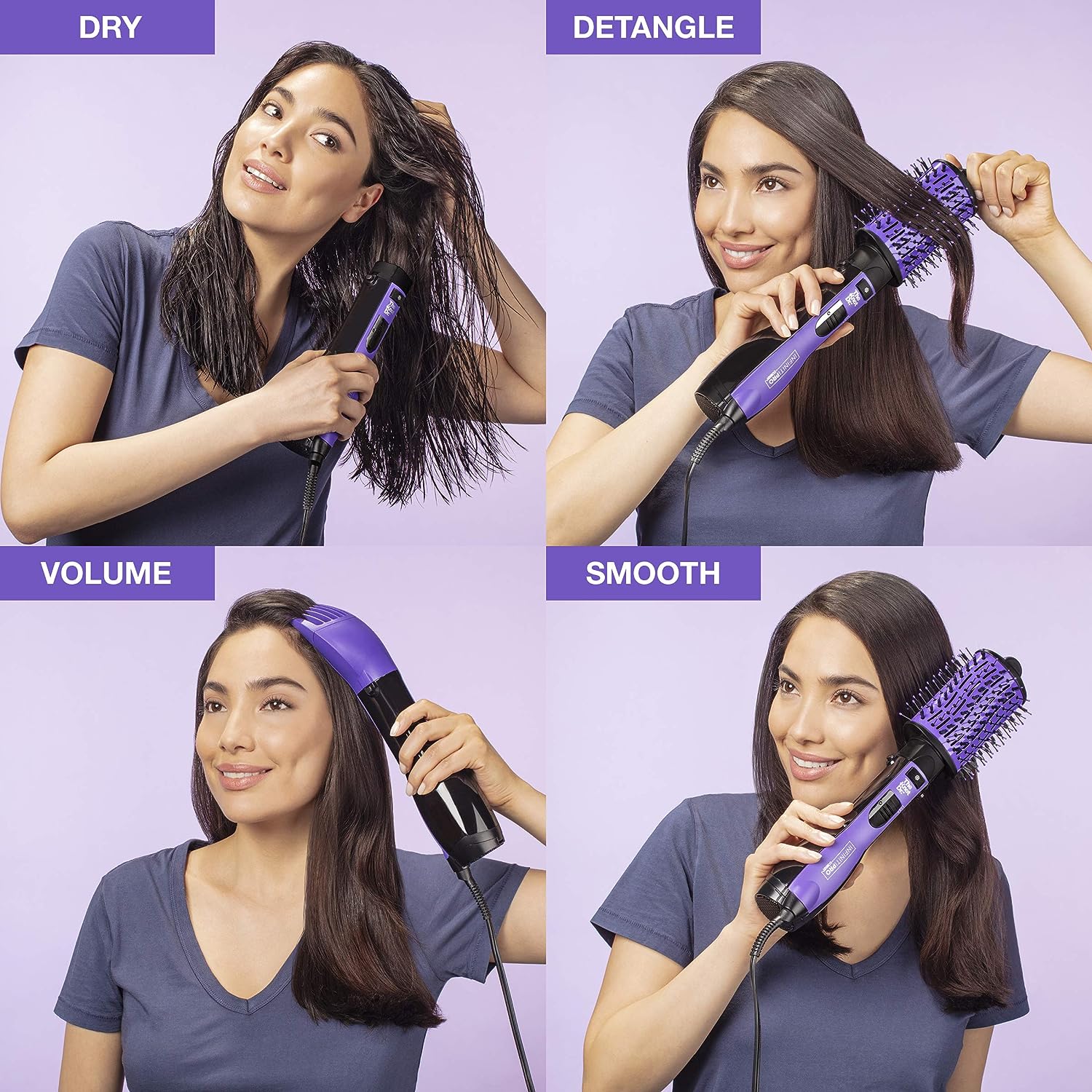 The INFINITIPRO BY CONAIR Detangling Hot Air Brush is the perfect addition to your hair styling tools. This hair dryer and volumizer can be used to style wet or dry hair detangling it with The Knot Dr. Flexalite Bristles while adding volume and shine from the ceramic coated barrel and ionic generator. The vertical airflow vents allow for optimal performance along the oval shaped barrel, which smooths the hair out while adding volume at the root and soft bouncy curls at the ends. This Hot Air Brush is perfect for any age or hair type with its 2 heat settings plus cool shot button with 1,000 watts for powerful, quick hair drying and styling. 6-foot professional line cord. Bonus: volume pik attachment included for extra root lift.