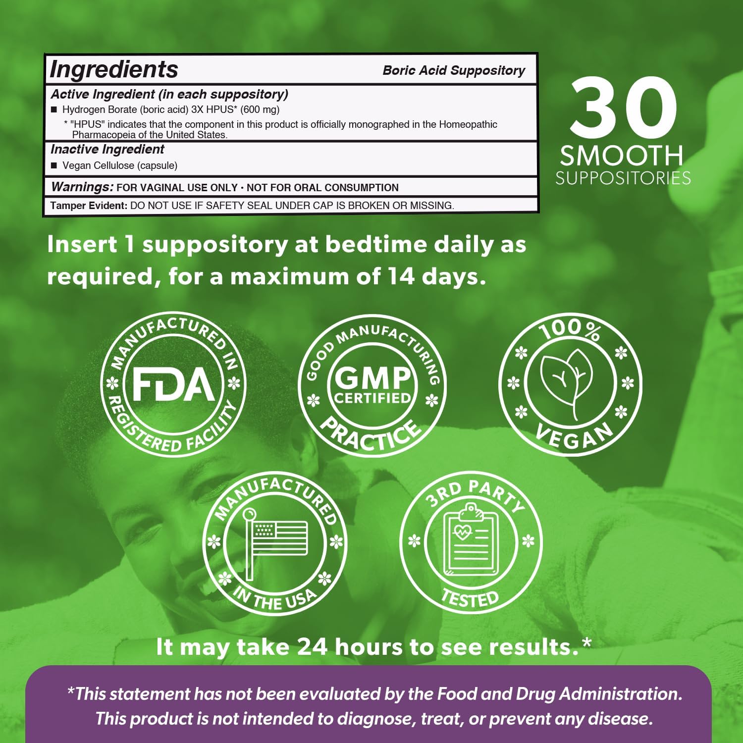 This kit contains 30 vegan Boric Acid suppositories that dissolve faster than gelatin and effectively prevent odors and discharge caused by pH imbalances. It helps reduce itching within 24 hours, leaving you feeling fresh, clean, and confident. Unlike many alternatives, Intimate Rose Boric Acid is backed by science to restore freshness quickly. Made in the USA with 100% pure Boric Acid, it’s a gentle, non-burning solution that ensures comfort and helps maintain a healthy pH balance.