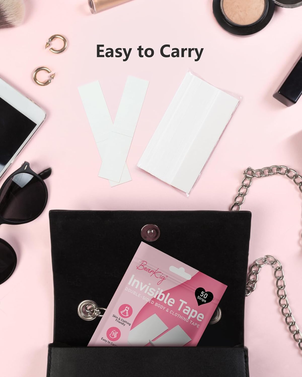 EASY TO CARRY & MULTI USE TAPE: BearKig tape for fashion with a convenient 50 strips. It's so small you can easily put it in your pocket or carry-on bag, is your best companion for travel and business trips. In addition, it has a wide range of uses. Can be used for high heels or shoes in addition to women's fashion clothing, used to prevent uncomfortable friction.Also can fix men's collars, lapel, pocket, bow tie, and belt end the list goes on. Make men more neat and decent.