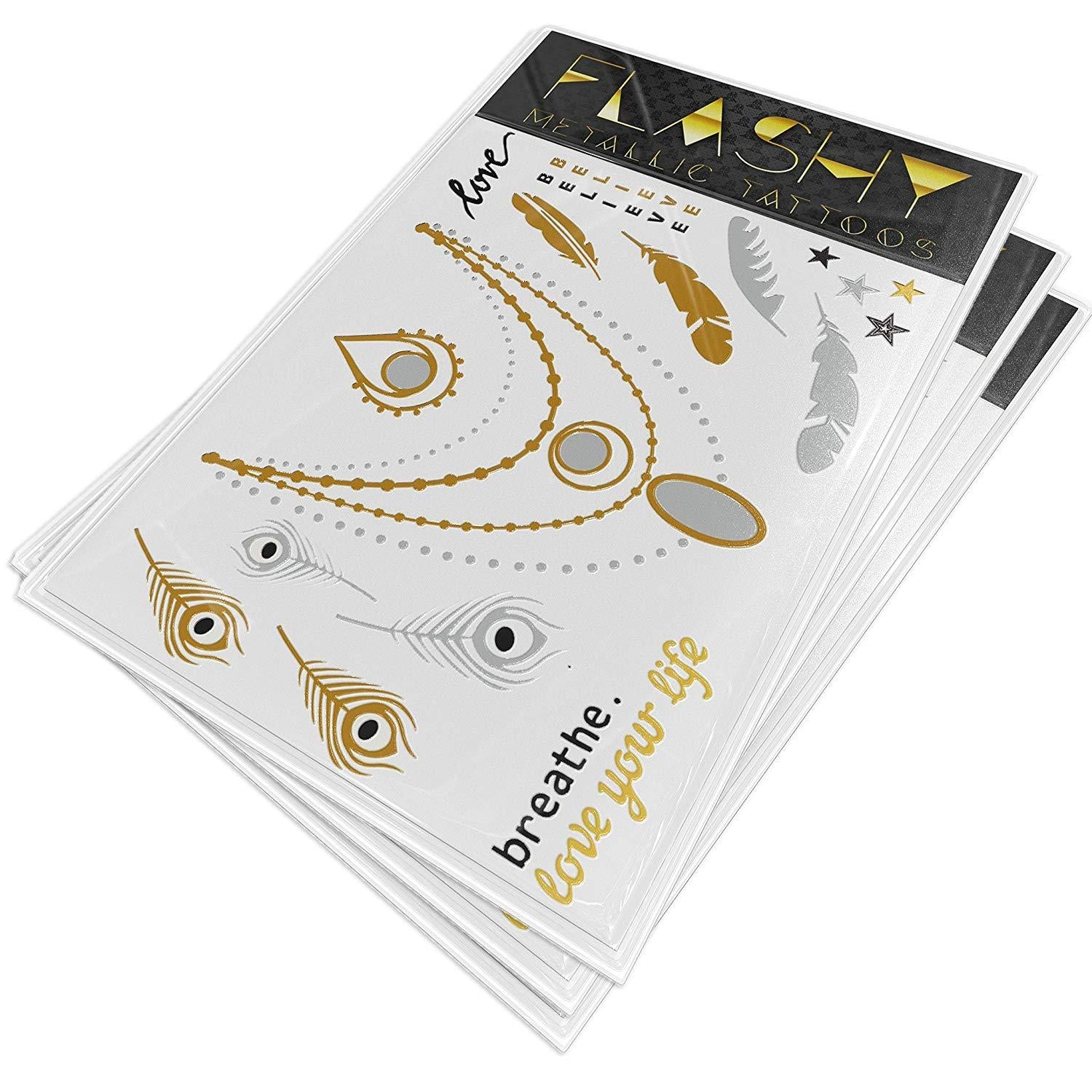 - Flashy Tats were painstakingly designed with crisp, perfect edges and extremely intricate lines to make a stunning impression. Golds, silvers and bronzes attract the light and shimmer beautifully on all skin tones, truly functioning as designer accessories. Just don’t be surprised when your friends think they’re real tattoos or jewelry.