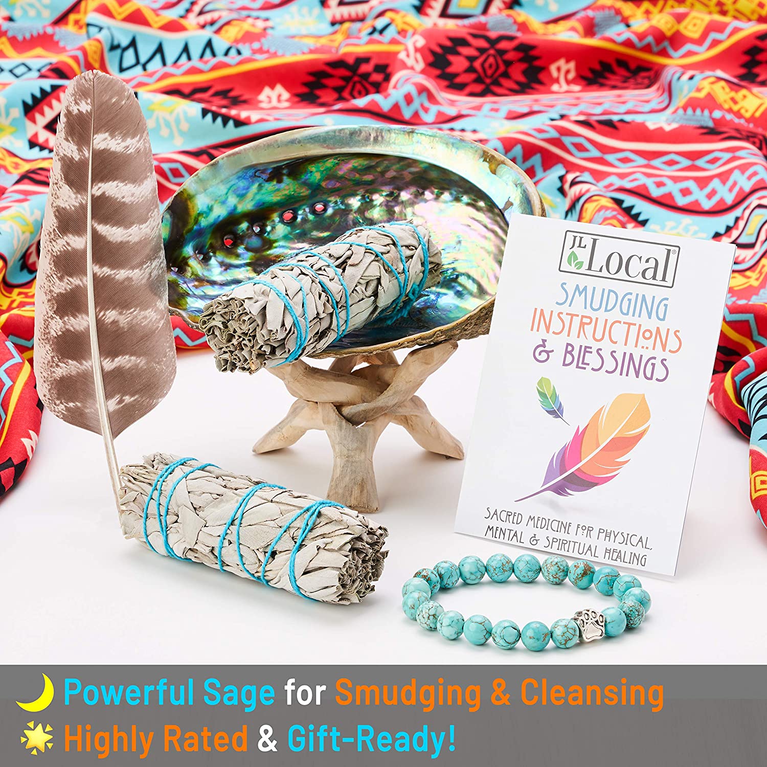JL Local 2 White Sage Smudge Stick Smudging Kit Abalone Shell & Stand, Turquoise Bracelet, Instructions & Blessings, Smudge Kit White Sage Incense Sticks for Cleansing