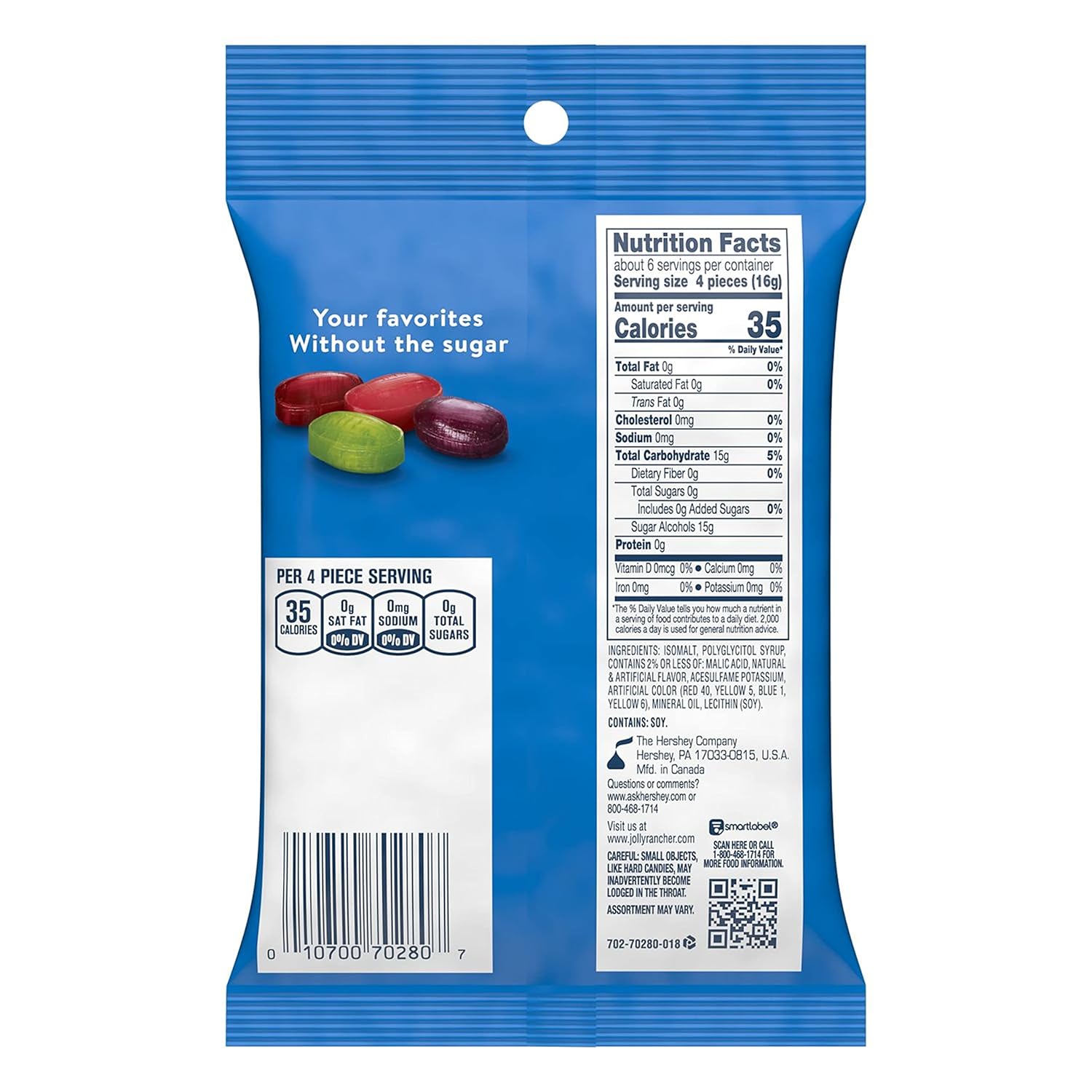 A mix of four fruity favorites for the whole family in just one bag of hard candy? You wouldn't have thought it possible if you didn't know JOLLY RANCHER candy. This bag of sugar-free, individually wrapped fruit-flavored hard candy will keep each delicious piece fresh until it's time for a new bag. Featuring raspberry, apple, grape and watermelon flavors, JOLLY RANCHER Zero Sugar hard candy offers a combination of the undisputed classics you know and love with a sugar- and aspartame-free twist. Keep a bag with you on the go to share with friends, co-workers and family members throughout the day — but don't forget to save some for yourself during all that sharing! These fruit candies make the perfect candy bowl display all year thanks to vibrant colors and attractive JOLLY RANCHER wrappers. They're also great sugar-free treats for holiday stockings, Easter baskets, Valentine's Day party favors and Halloween trick-or-treat bags. If you want a small candy with a big taste to keep your taste buds busy during movie nights, lunch breaks and snack breaks, JOLLY RANCHER Zero Sugar hard candy is the treat for you.
