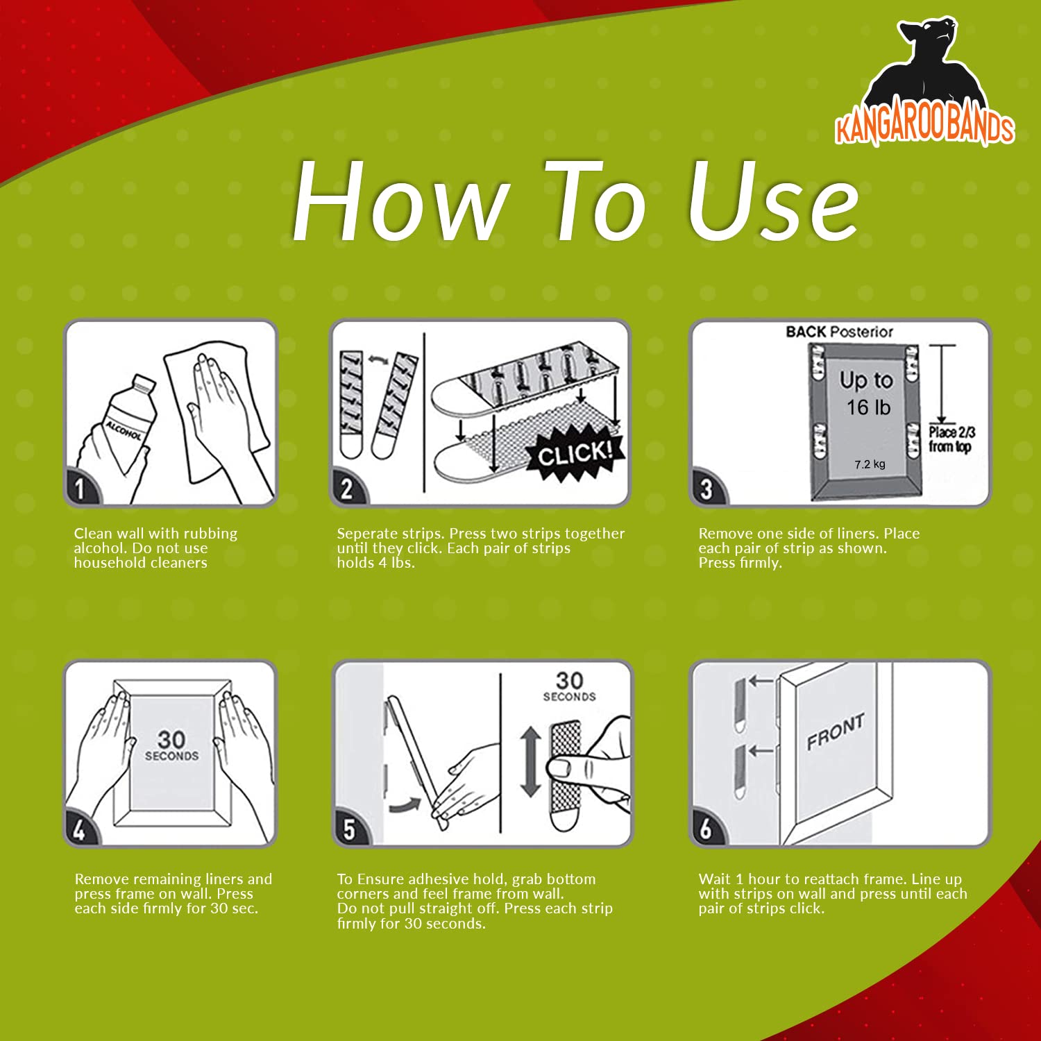 KangarooBands Complete Picture Hanging Kit has everything you need to hang photos with ease and no wall damage. Includes 4 pairs of genuine 3M Command Strips that hold up to 12 lbs (with 4 strips), ideal for frames up to 18"x24". Perfect for drywall, tile, or wood surfaces—no tools or nails needed. Clean removal with no marks. Also includes a bubble leveler to keep your pictures perfectly straight. Great for home, office, or dorm use!