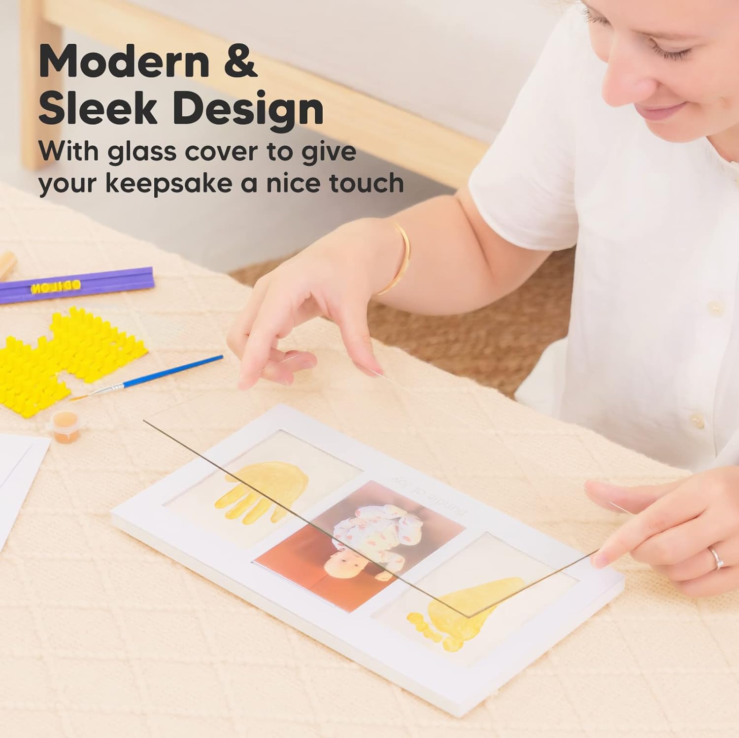 Handcrafted wooden frame, protected by a durable glass cover—ensuring your baby's imprints are preserved for a lifetime. Tiny moments may be fleeting, but a quality keepsake lasts a lifetime.