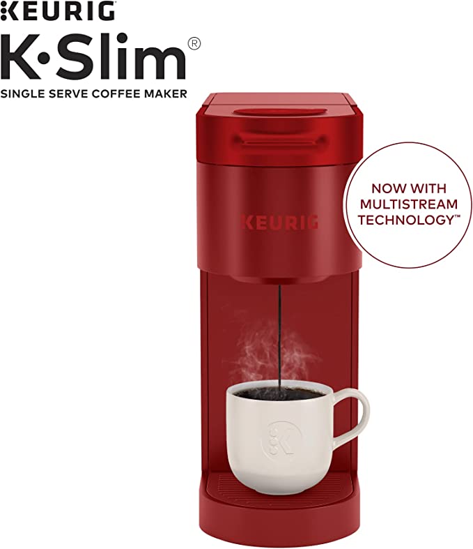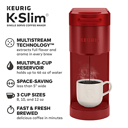 Enjoy ease and great taste in little space with the Keurig® K-Slim® single serve coffee maker in Scarlet Red. The K-Slim® coffee maker features MultiStream Technology™, an innovative way to more evenly saturate the coffee grounds* in every K-Cup® pod. This technique extracts full flavor and aroma from your K-Cup® pod, so you can enjoy an exceptionally flavorful experience every time you brew. At just 5” wide, the K-Slim® single serve coffee maker fits neatly on your countertop, making it the perfect choice for when space-saving and simplicity are important. The K-Slim® brewer brings together the performance and simplicity that Keurig is known for, in a slim and sleek design. You also get the convenience you desire with the capacity to brew up to four 8 oz. cups before refilling the 46 oz. removable water reservoir, and the ability to enjoy a fast and fresh-brewed 8, 10, or 12 oz. cup at the push of a button. Choose from hundreds of flavorful K-Cup® pod varieties of coffee, tea, cocoa, and more. With the K-Slim® brewer, your delicious morning cup or midday pick-me-up is always ready in minutes, and you never have to sacrifice countertop space for taste again. *vs. leading national Keurig® K-Classic® brewer.