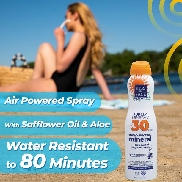 At Kiss My Face, we believe that a sunscreen should do more than provide broad spectrum sun protection. That’s why we use 100% mineral active ingredients in our Purely Mineral SPF 30 Sunscreen Spray. This fragrance-free formula also contains Nourishing Antioxidant Defenders® like aloe and olive oil to help moisturize your skin, plus green tea. It is sweat and water resistant for up to 80 minutes, meaning you can have fun in the sun, pool or at the beach – wet or dry. Kiss My Face Organics Purely Mineral SPF 30 Sunscreen Spray also contains organic safflower oil, plus green tea. It is 100% vegan, and both phthalate and paraben free. When used properly, mineral sunscreens will leave a whitish tint, which is what you want for proper protection. Be sure to reapply Purely Mineral SPF 30 Sunscreen Spray as needed. Practice Safe Sun.™