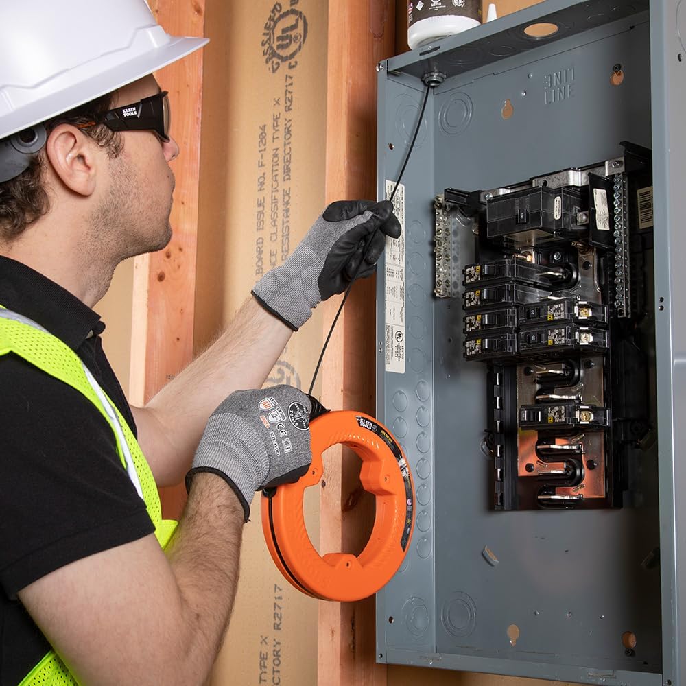 Klein Tools 56331 features a 50-foot, 1/8-inch wide steel fish tape designed for tough wire pulling jobs. The double loop tip improves grip and helps guide wires smoothly through conduits and around bends. Its optimized high-impact housing ensures durability and allows easy payout and rewind of the tape. The comfortable handle provides better control and reduces hand fatigue, making it ideal for electricians and contractors working in residential and commercial settings. Reliable, strong, and built to last.