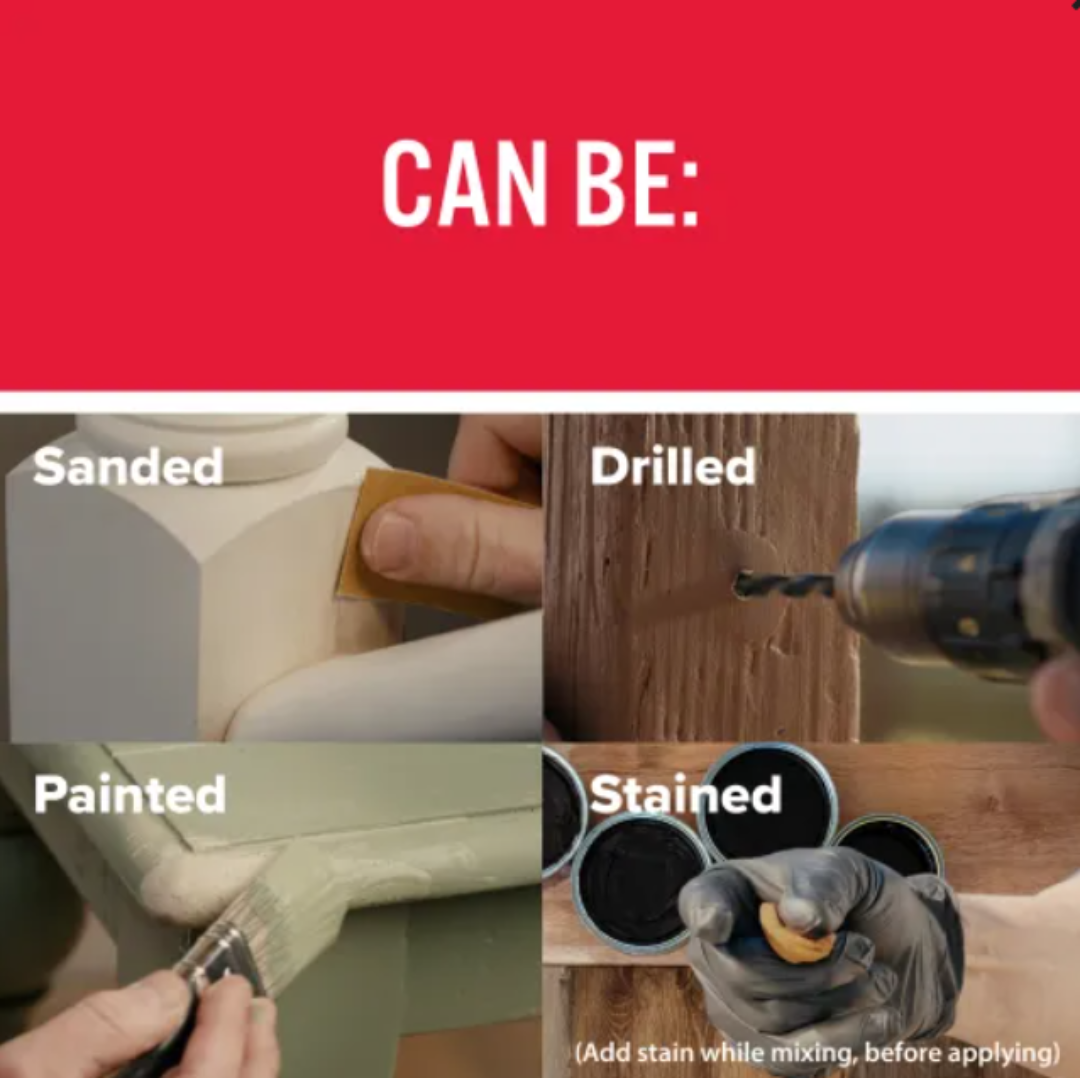 KwikWood™ is a hand-mixable epoxy putty, formulated to repair and rebuild wood. After mixing, it cures to the same density as wood and becomes an integral part of the repair. For use on exterior or interior applications, it contains no solvents, will not rot, shrink, crack or pull away. KwikWood™ has a 15-25 minute work life. After 60 minutes, it can be machined, drilled, tapped, sanded, filed and painted. Stronger than wood, KwikWood™ dries to a light tan color.