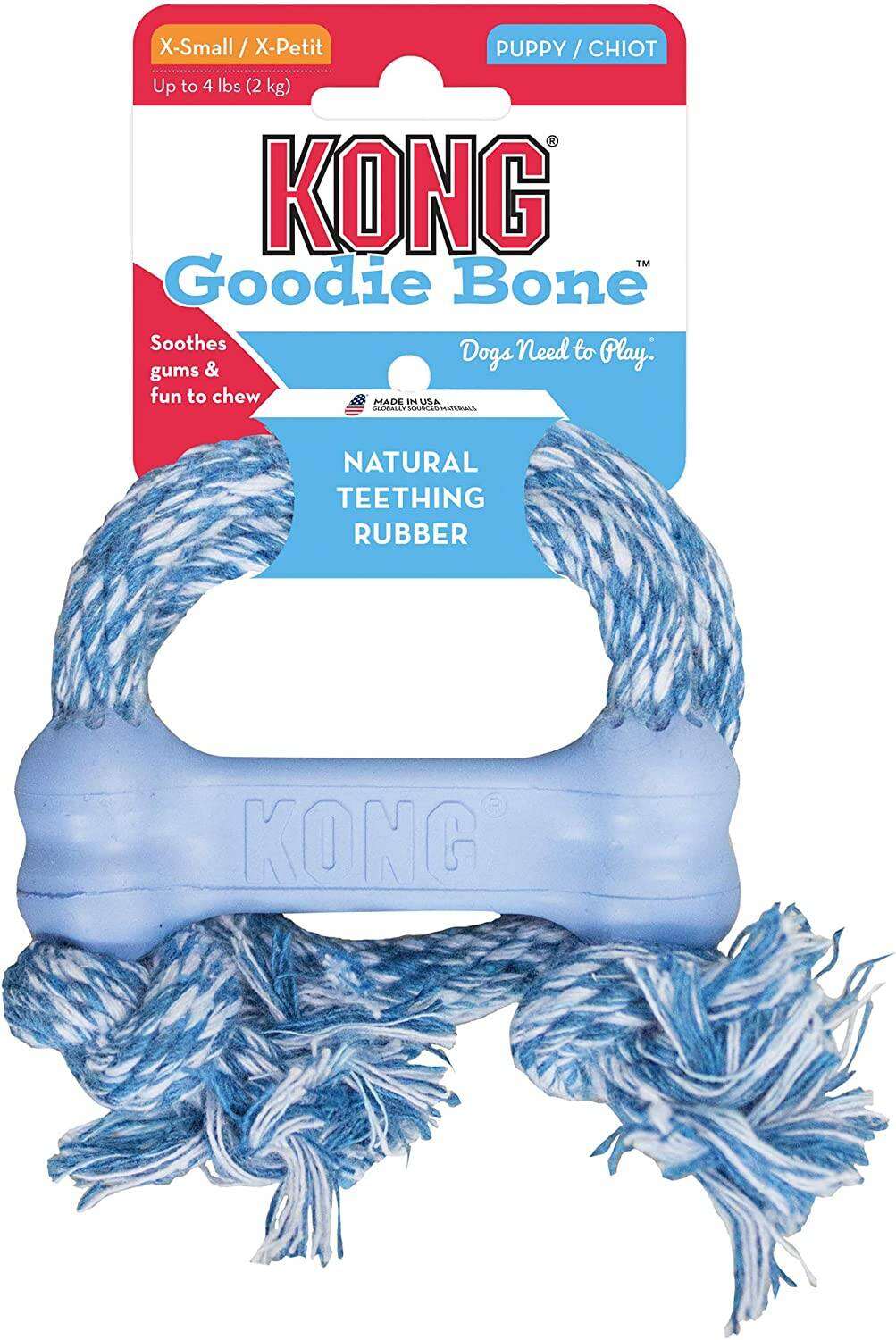 The KONG Puppy Goodie Bone with Rope engages puppies that delight in chew sessions, while the all-natural cotton rope making it an ideal toy to fulfill a puppy's instinctual needs. Made from the KONG Classic unique a puppy rubber, this bone teaches puppies appropriate chewing behavior while easing aching teeth and gums. It also has the added delight of an all-cotton rope that gives puppies multiple chewing choices.