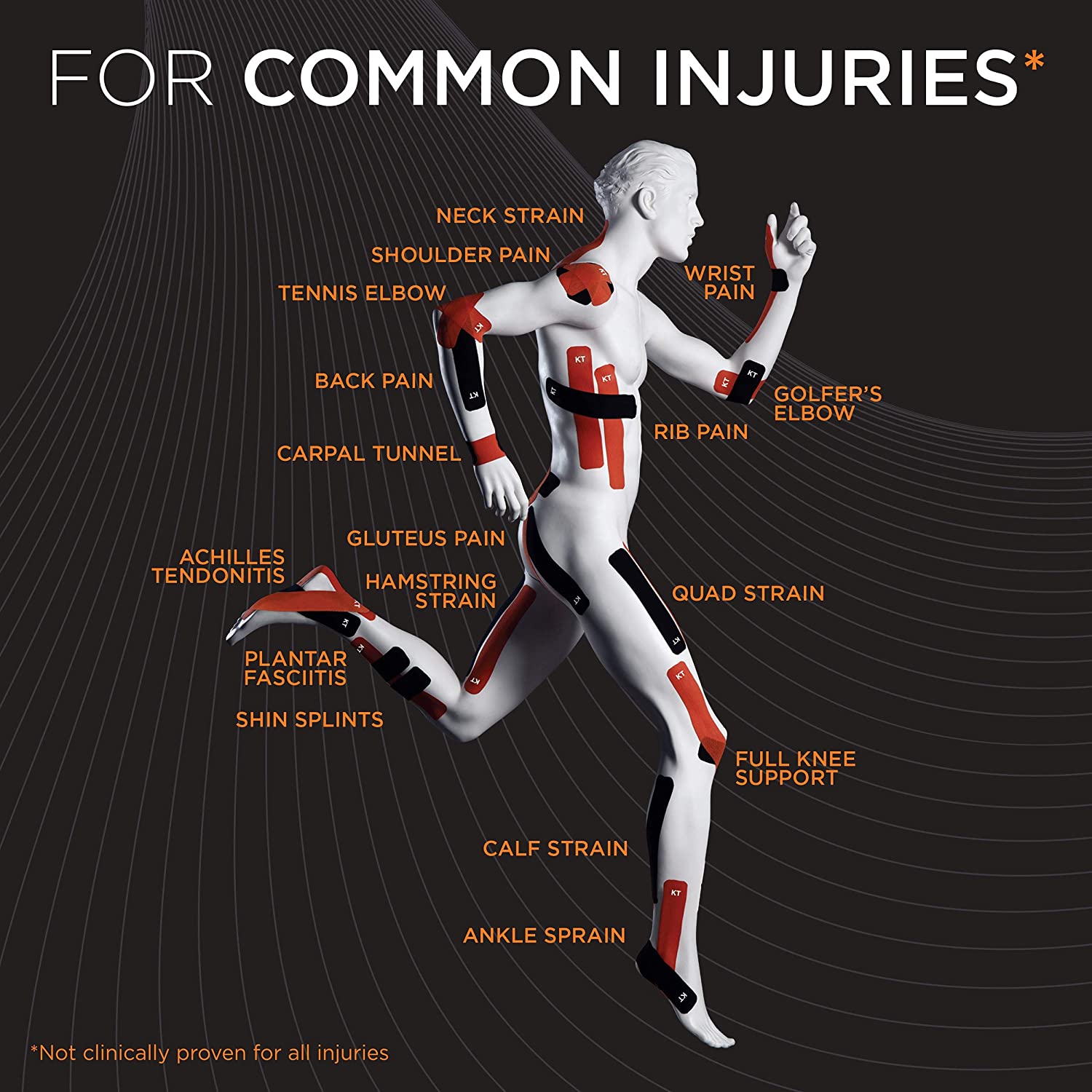 Whether you are training for your first marathon, getting ready for your first game, reaching a personal fitness goal, or just trying to get through the day, nothing slows you down more than pain and injury. KT Tape is light weight, comfortable to wear, and can be used for hundreds of common injuries. KT Tape helps reduce pressure to the tissue and may reduce discomfort or pain.