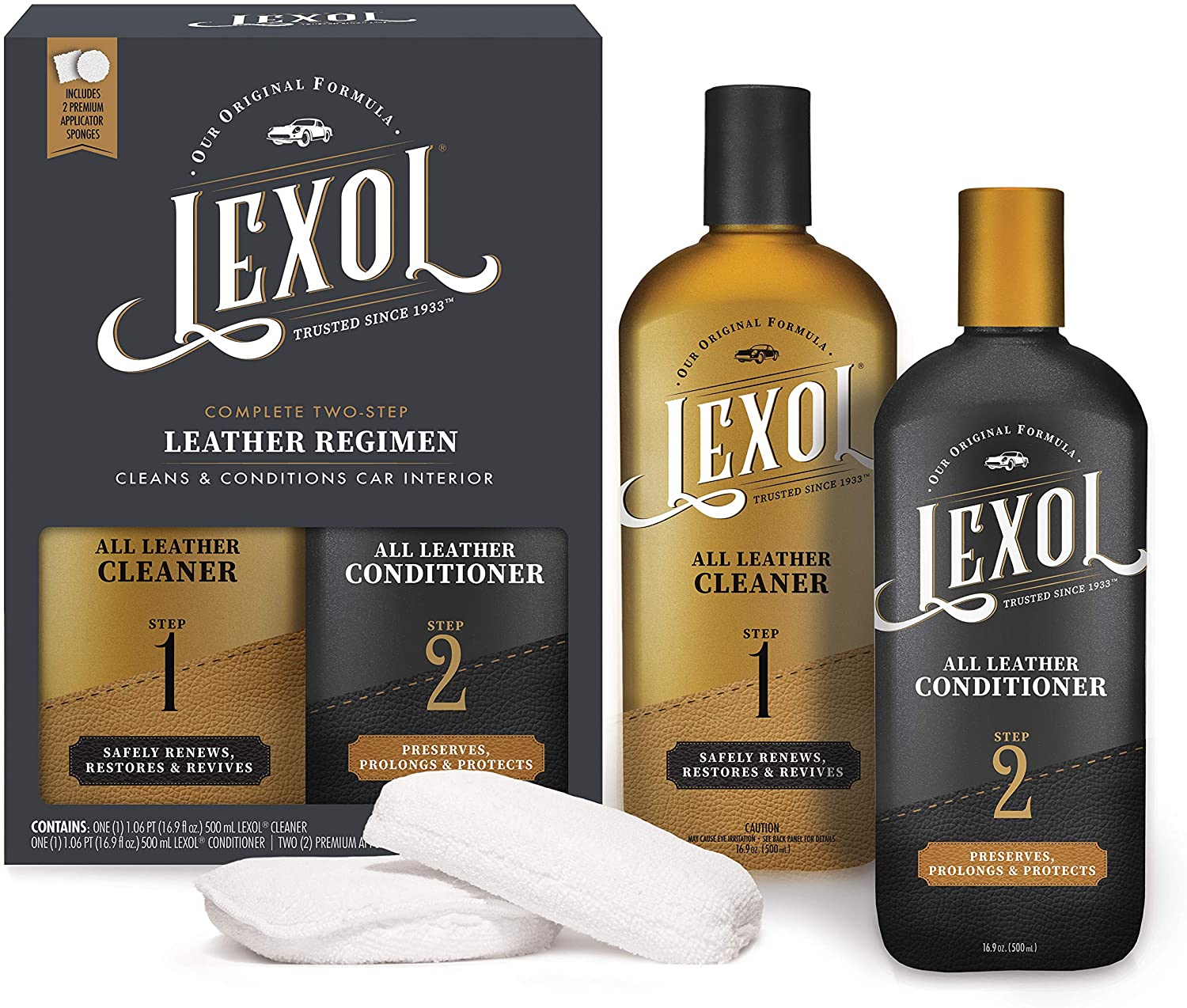 The elements are not kind to your leather investments. Fortunately, you can protect them with the 2-step Lexol Leather Care Regimen Kit. With one of the supplied premium applicator sponges, massage Lexol Leather Deep Cleaner into your leather and simply wipe dirt and oils away to restore a like-new appearance. Then, with the other sponge, apply Lexol Leather Deep Conditioner—in minutes, your leather will absorb the fine oil droplets, nourishing and restoring flexibility to defend against cracking without leaving greasy residue. Treating every 6 months will extend the life of your finished leather investments: car seats, leather furniture, briefcase, satchel, shoes, jacket, and sports equipment. Protect the leather you love with the Lexol Leather Care Regimen Kit. Lexol, Trusted since 1933.