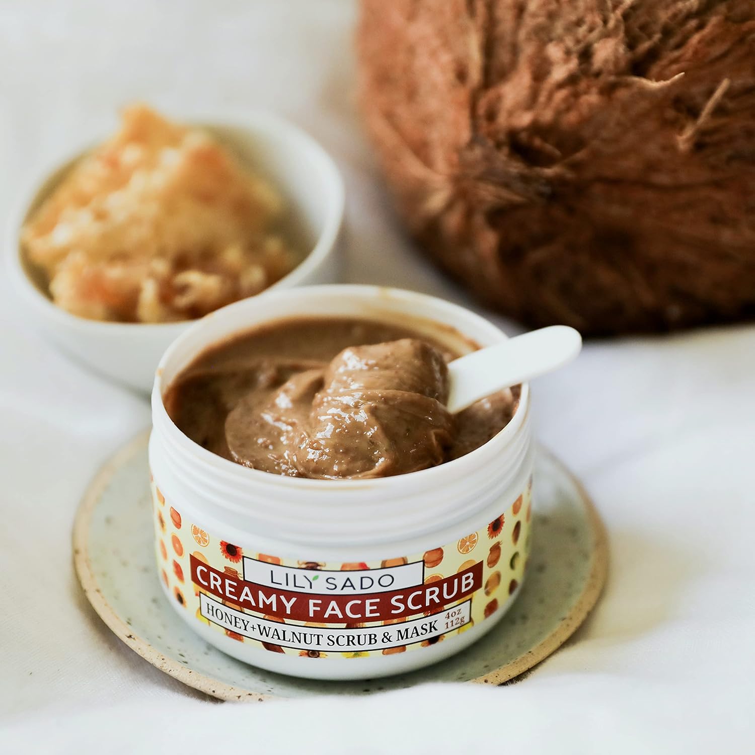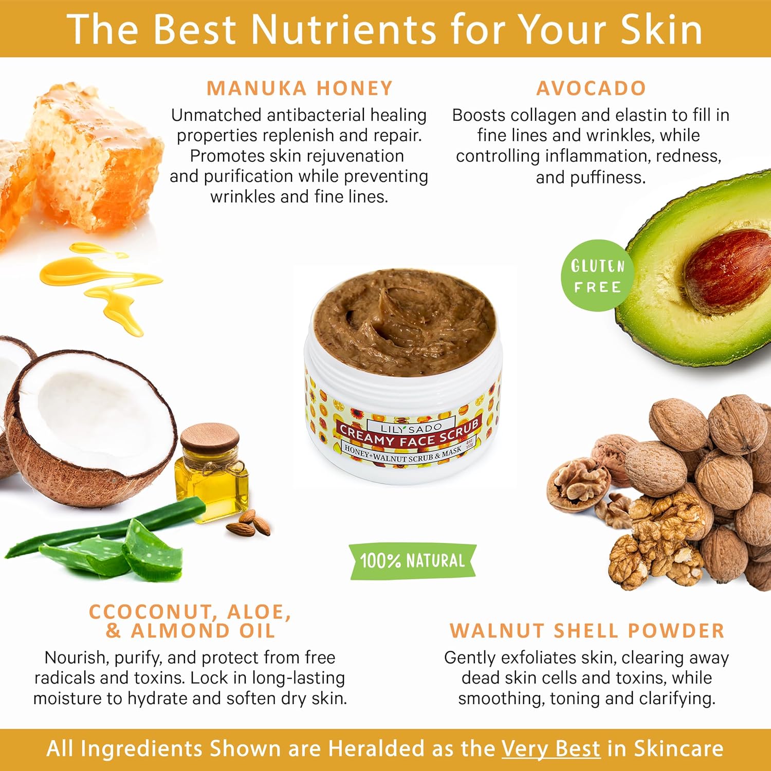 This exfoliating scrub blends Manuka Honey, Coconut, Avocado, and 5 hydrating oils to gently buff away dead skin with Walnut Shells. It works as both a scrub and a 10-minute facial treatment to balance skin, reduce wrinkles, and deeply moisturize. Safe for all skin types and helps combat acne and blemishes.