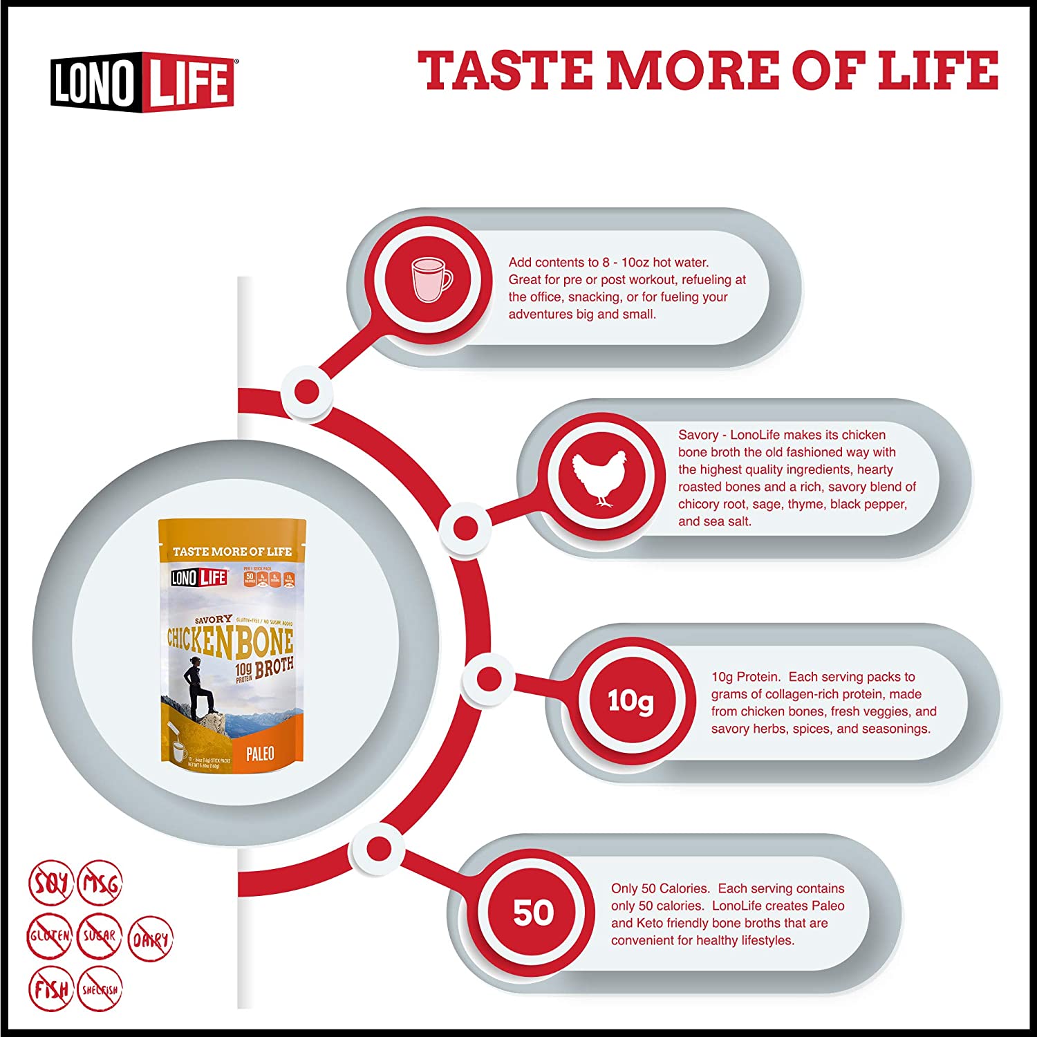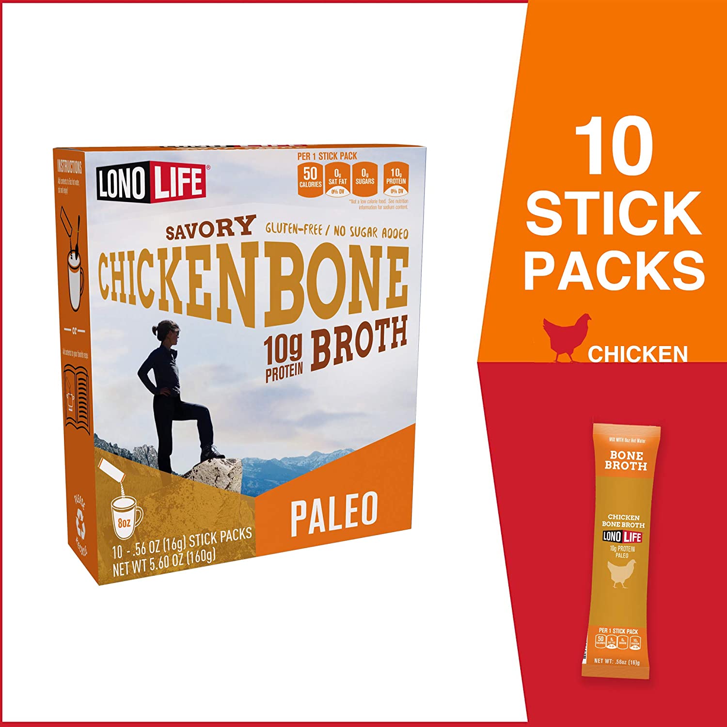 LonoLife Savory Chicken Bone Broth Powder Paleo and Keto Friendly, 10 Individual Stick Packets