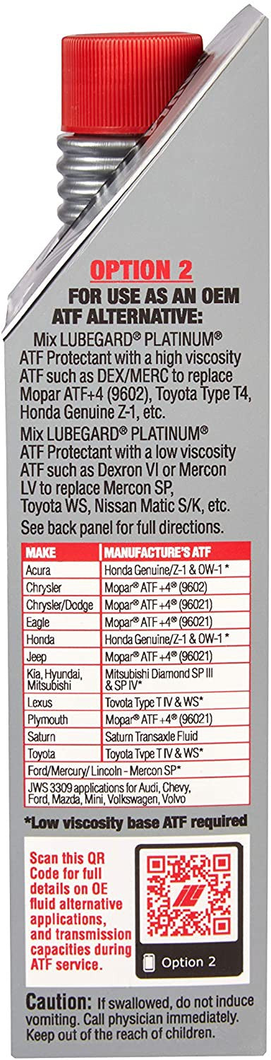 Lubegard Platinum Universal ATF Protectant is a uniquely formulated transmission technology used to convert regular Dexron/Mercon ATF into OEM ATF types. They can perform like highly friction modified ATFs such as: Honda Genuine ATF, Toyota Type T, Toyota Type T II, Toyota Type T IV, Mopar ATF + 3 (7176), Mopar ATF +4 (9602) and others. Lubegard is the number one product used in the transmission repair industry because it's the only product of its kind that has LXE technology. It is an award-winning technology that has gained the use and approval of multiple major car manufacturers and has been the written solution for transmission problems in eight car manufacturers technical bulletins. The professional transmission technicians use Lubegard to convert to dealer-only ATFs, but also to supplement depleted additive packages found in factory fill ATF (the original ATF your vehicle came equipped with). It provides the same (and in some cases better) performance characteristics of a dealer ATF with the added benefits of instant relief from shudder, slipping and noise. It also provides long term protection of the fluid and transmission itself from heat and wear. In order to find out if your vehicle came equipped with Mercon V fluid, Lubegard has the industry's most comprehensive listing of all makes and models, with factory fill and also the appropriate Lubegard conversion product if an alternative is needed to dealer-only fluids. DIRECTIONS FOR USE: Follow LUBEGARD ATF Conversion & Refill Chart for proper ATF conversions or use as a protectant with any OE ATF. For normal applications, add 1 oz. (29.6 mL) per quart (Liter) of ATF to the total transmission capacity (including torque converter) with motor idling in park. Do not overfill. Do no use with Ford Type F ATF or in CVT’s.
