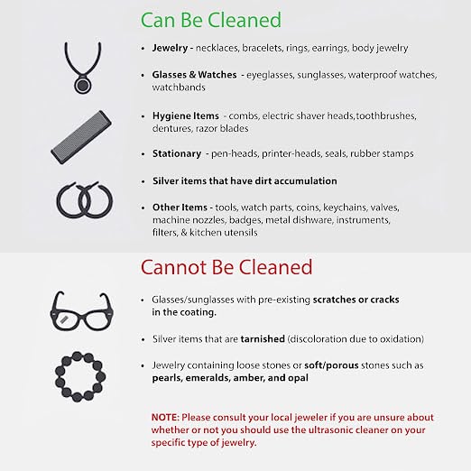 - CLEAN A WIDE VARIETY OF VALUABLESCleans jewelry, necklaces, rings, earrings, bracelets, coins, eyeglasses, keys, diamonds, silverware, metal badges, watchbands, waterproof watches, shaver heads, razor blades, dentures, combs, utensils, filters, instruments, tools, toothbrushes, valves, nozzles, machine parts, printer heads, and other valuables.What's IncludedMagnasonic Jewelry Cleaner, Cleaning Basket, Detailed Instruction Manual