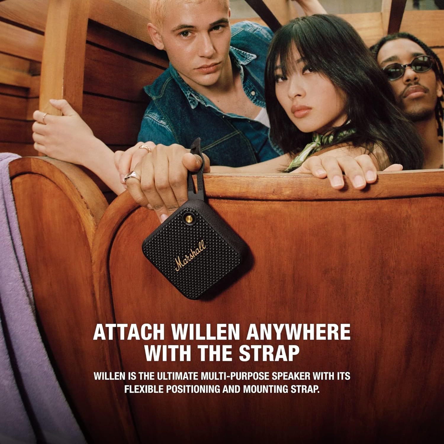 Willen is the mighty portable speaker that is made to go everywhere with you. Built with one 2’’ full range driver and two passive radiators, this speaker brings you the heavy Marshall sound you can’t live without. A top-of-class IP67 dust- and water-resistance rating means it’s always ready for the road. Willen brings together the iconic Marshall design with a ruggedness that dares you to push its limits. All this, plus its hefty 15+ hours of listening on a single charge and mounting strap mean that Willen is raring to go wherever you go.The shortest distance between you and your music is Willen – just pair and play without any complicated set-up. Get hands on with your music with the equaliser presets in the app and the multi-directional control knob on the unit. Answer, reject or end a call with a few simple clicks and the built-in microphone will make sure that no one misses a word. This compact powerhouse is the ultimate multi-tasker but your music is king. Willen comes with Stack Mode – just connect it to multiple other Willen speakers to amplify your sound with an immersive multi-speaker session. Power your music with Marshall signature sound every single time, even when the session isn’t planned